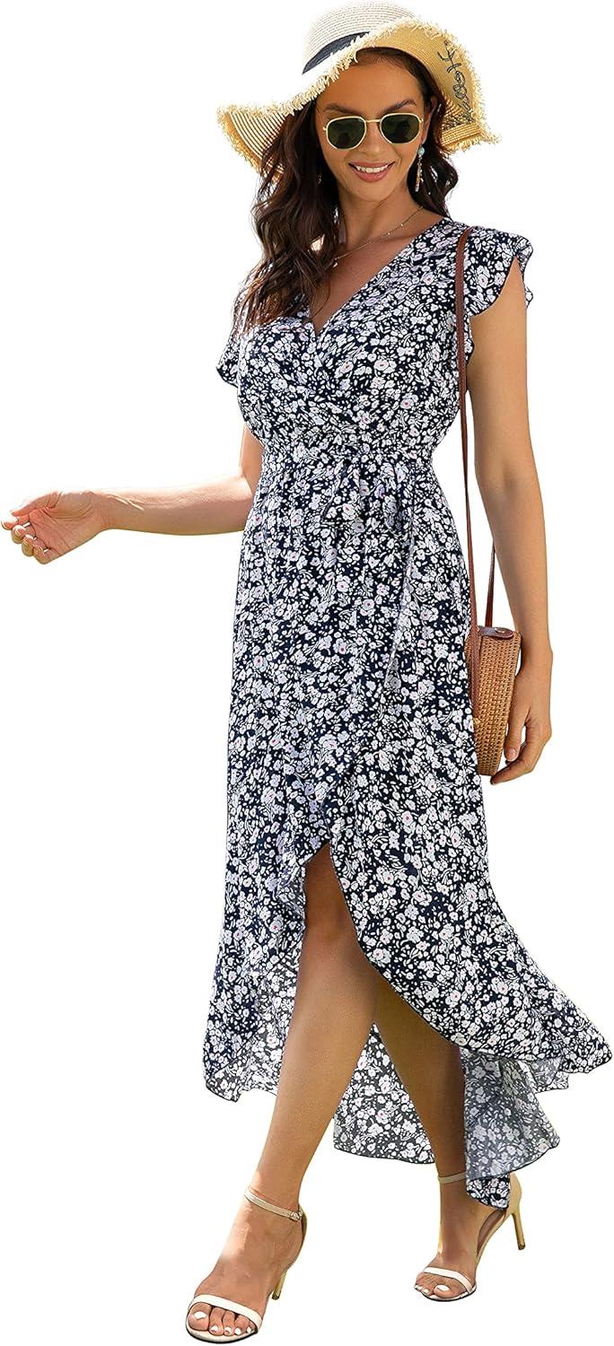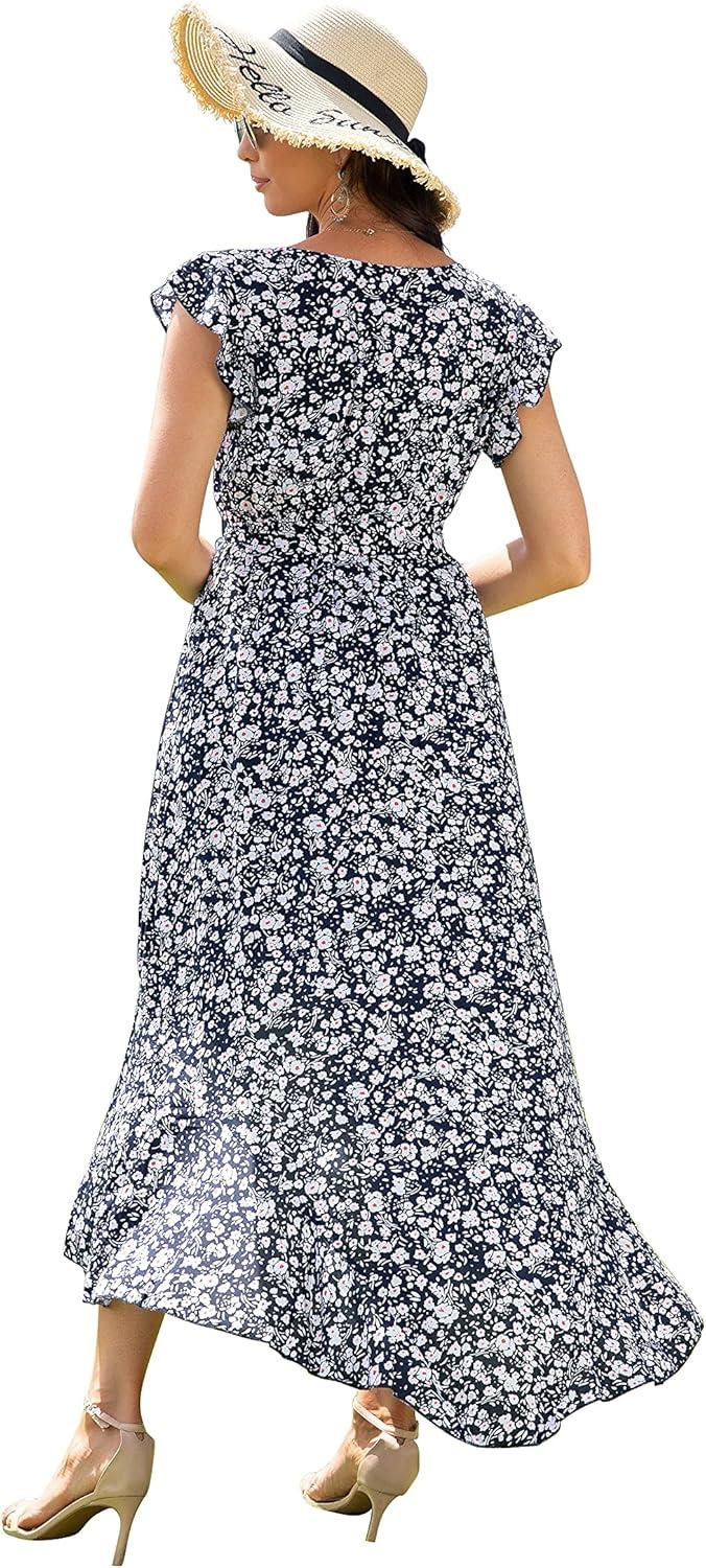 GRECERELLE 2026 Women’s Spring Summer Boho Floral Print V-Neck Faux Wrap Maxi Dress for Wedding Guest, Graduation, Party(20 Fp Jasmine Navy)