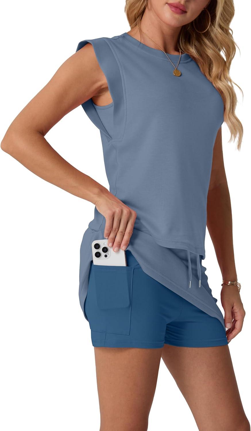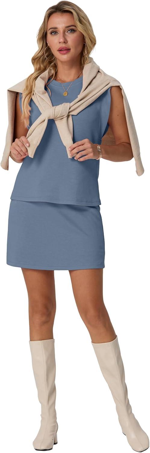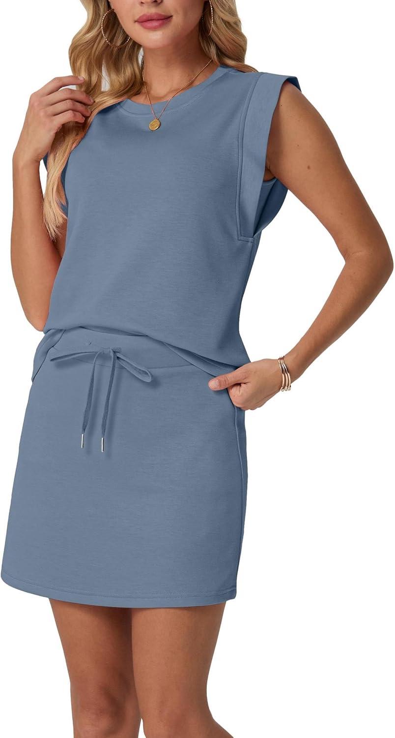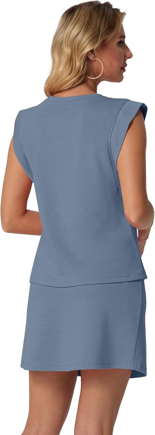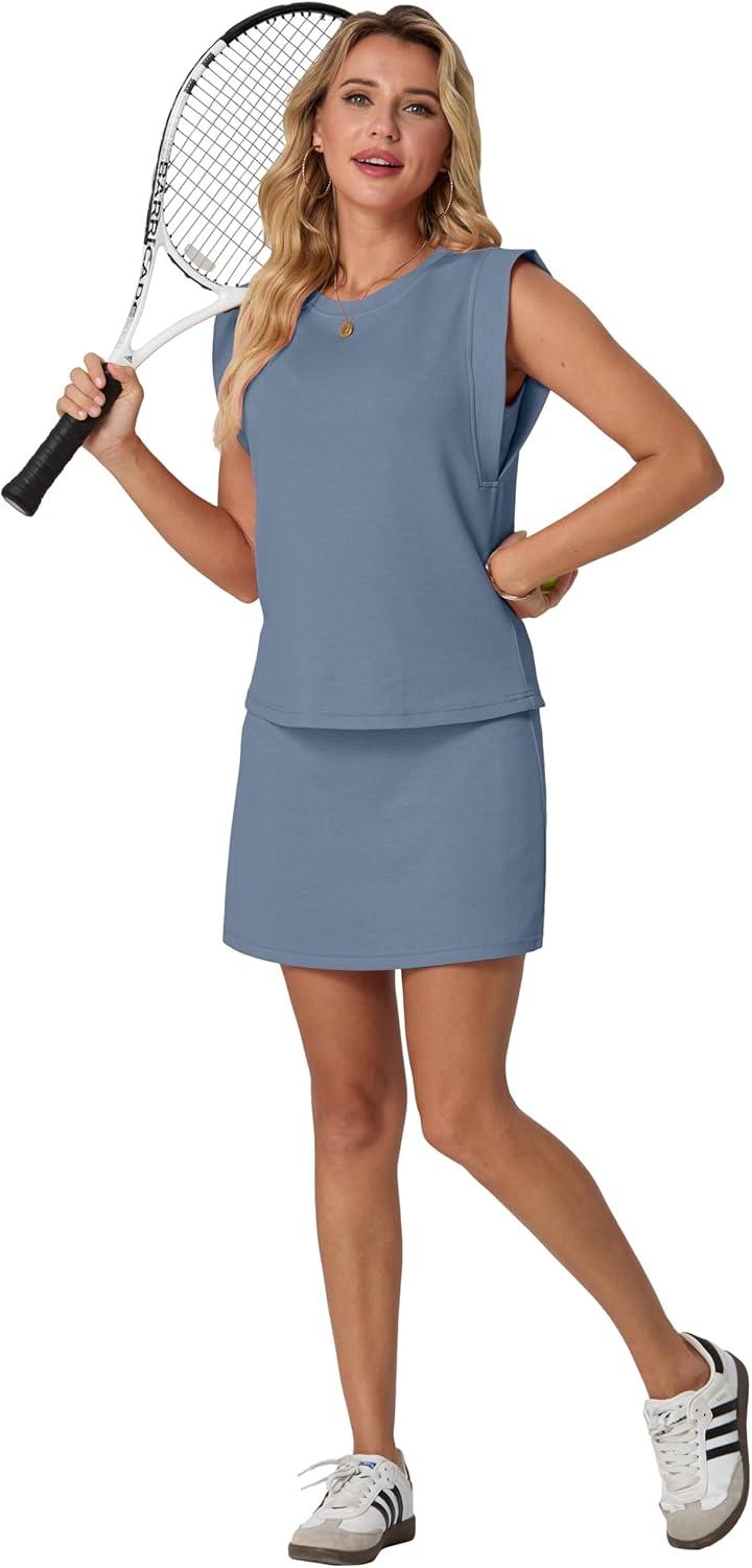 GRECERELLE 2026 Women's Summer 2 Piece Skort Set Cap Sleeve Round Neck Top & Tennis Skirt with Pockets for Athletic & Casual(Denim Blue)