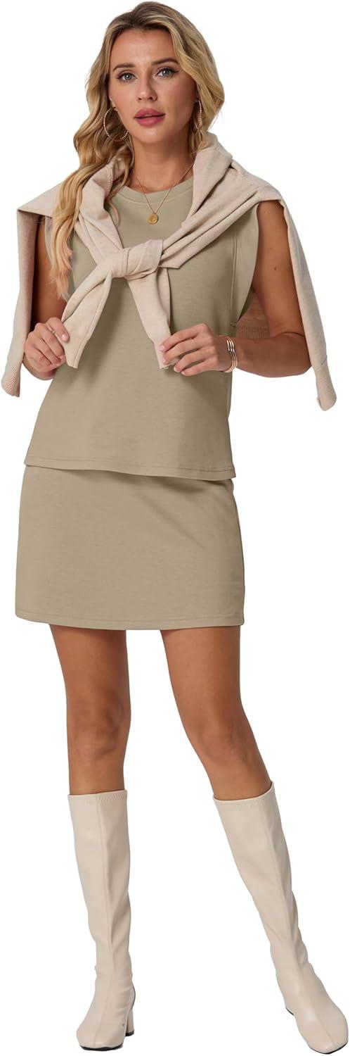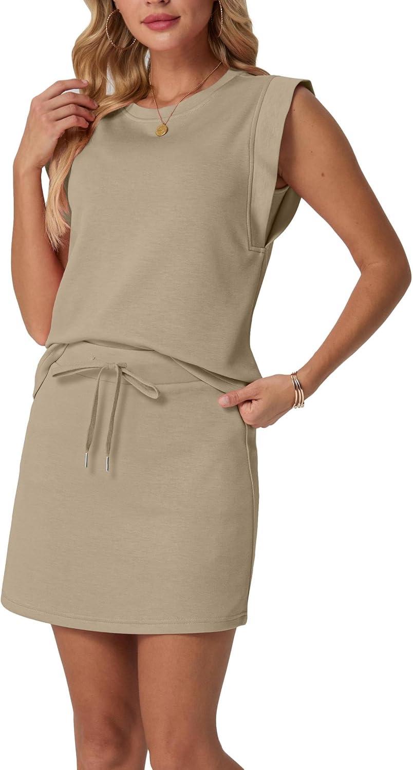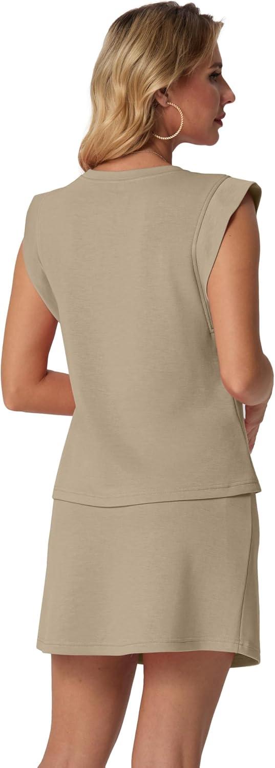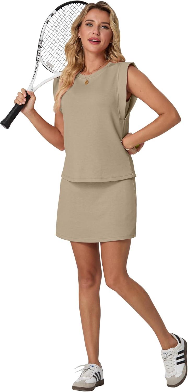GRECERELLE 2026 Women's Summer 2 Piece Skort Set Cap Sleeve Round Neck Top & Tennis Skirt with Pockets for Athletic & Casual(Khaki)
