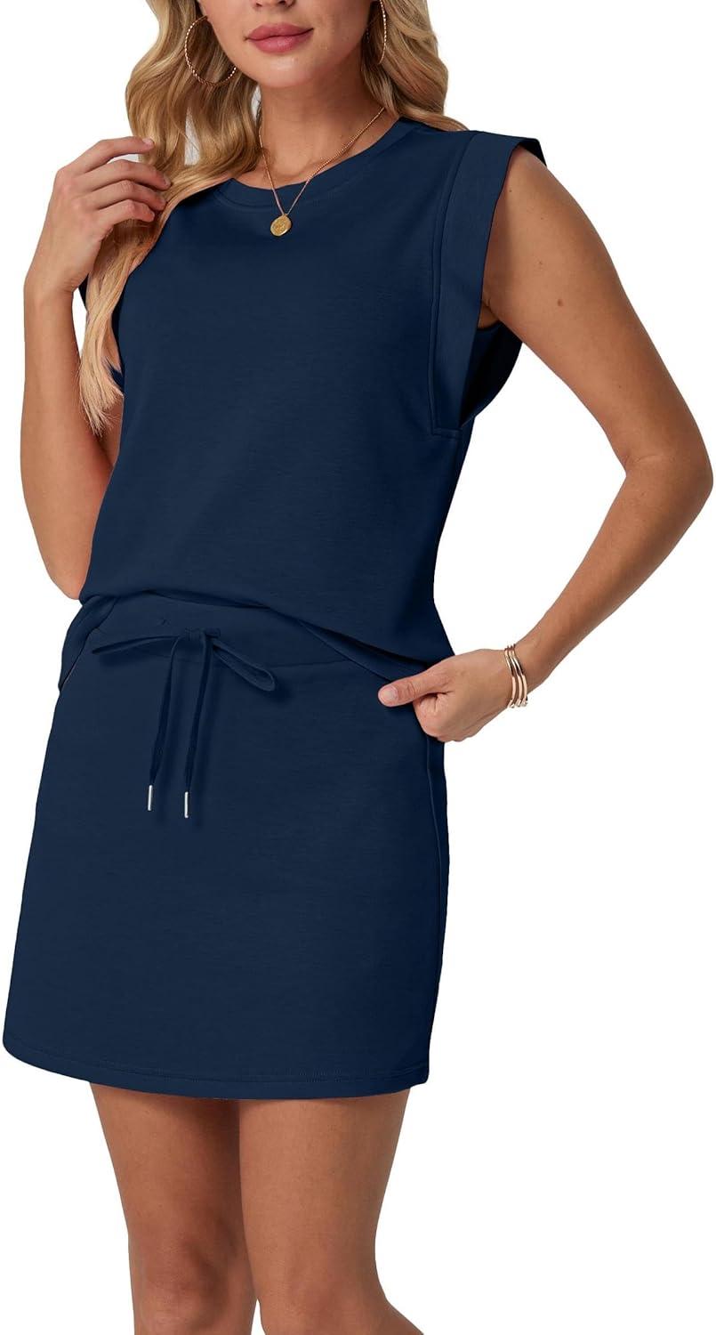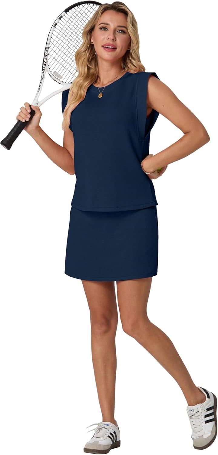 GRECERELLE 2026 Women’s Summer 2 Piece Skort Set Cap Sleeve Round Neck Top & Tennis Skirt with Pockets for Athletic & Casual(Navy Blue)