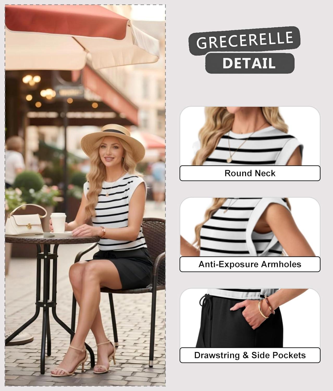 imageGRECERELLE 2026 Womens Summer Dresses Round Neck Sleeveless Tie Waist Casual Mini Sundresses with PocketsWhite Black Stripe