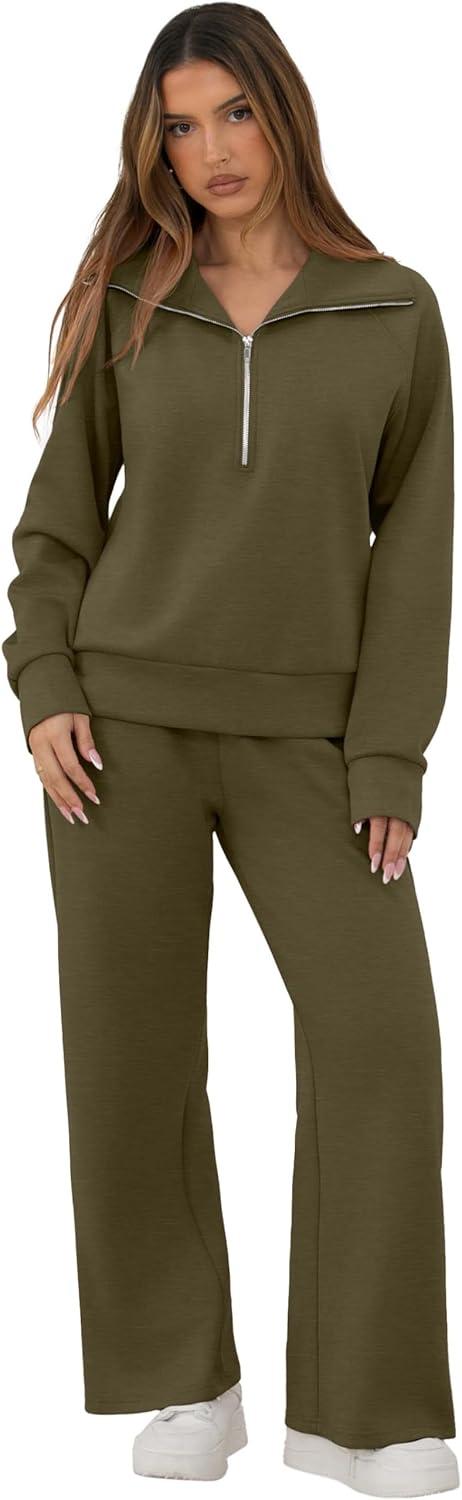 GRECERELLE Lounge Sets For Women 2025 Casual Lapel Half Zip Sweatshirt And Wide Leg Sweatpant 2 Piece Outfits Tracksuit Sets(Army Green)