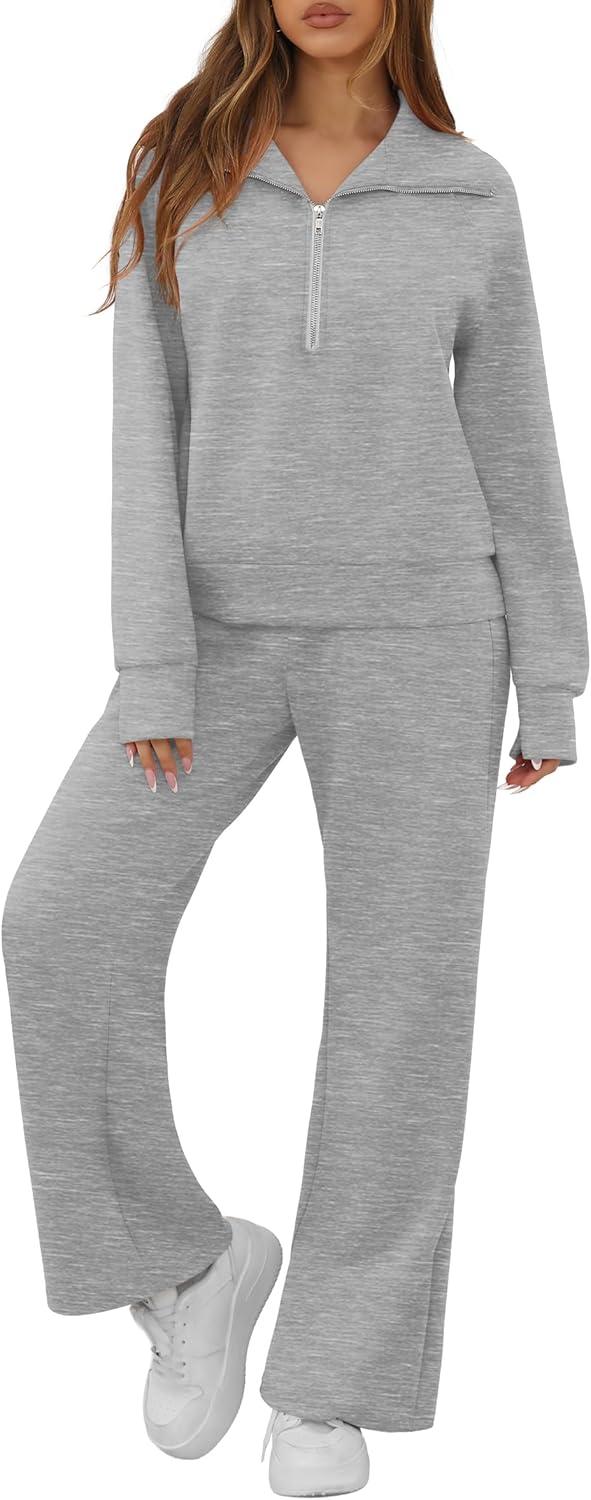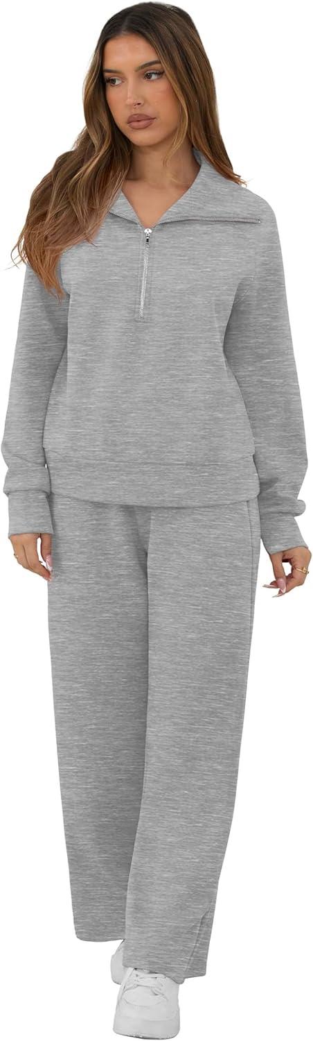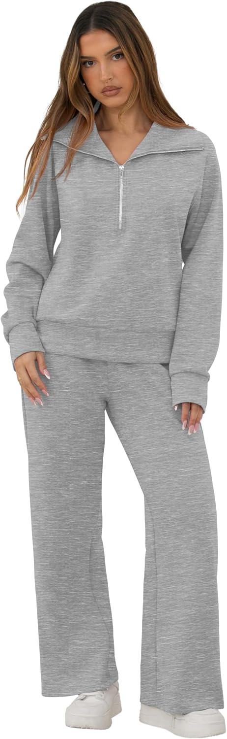 GRECERELLE Lounge Sets For Women 2025 Casual Lapel Half Zip Sweatshirt And Wide Leg Sweatpant 2 Piece Outfits Tracksuit Sets(Dark Grey)