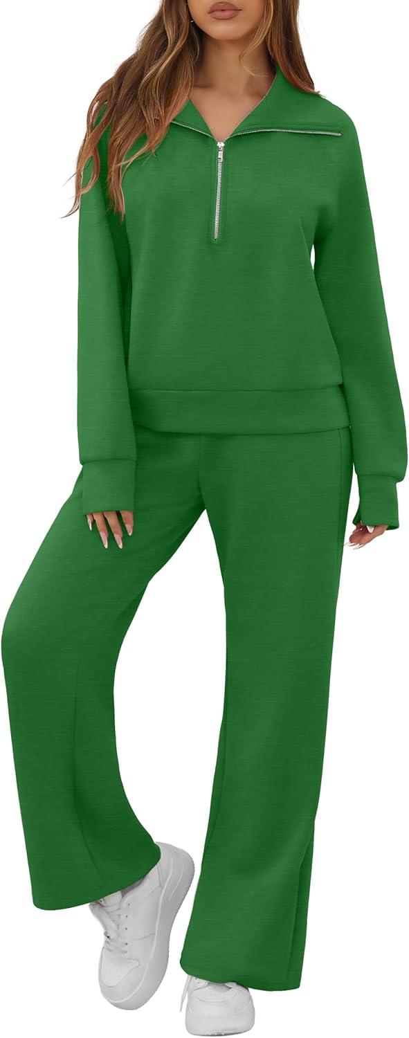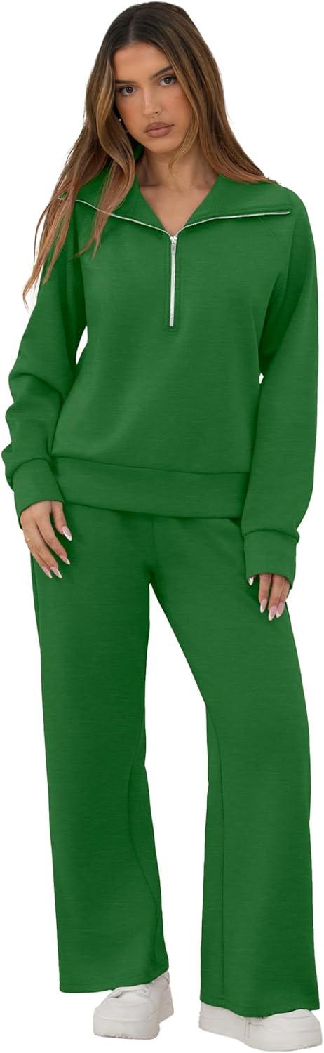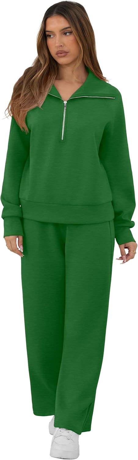 GRECERELLE Lounge Sets For Women 2025 Casual Lapel Half Zip Sweatshirt And Wide Leg Sweatpant 2 Piece Outfits Tracksuit Sets(Green)