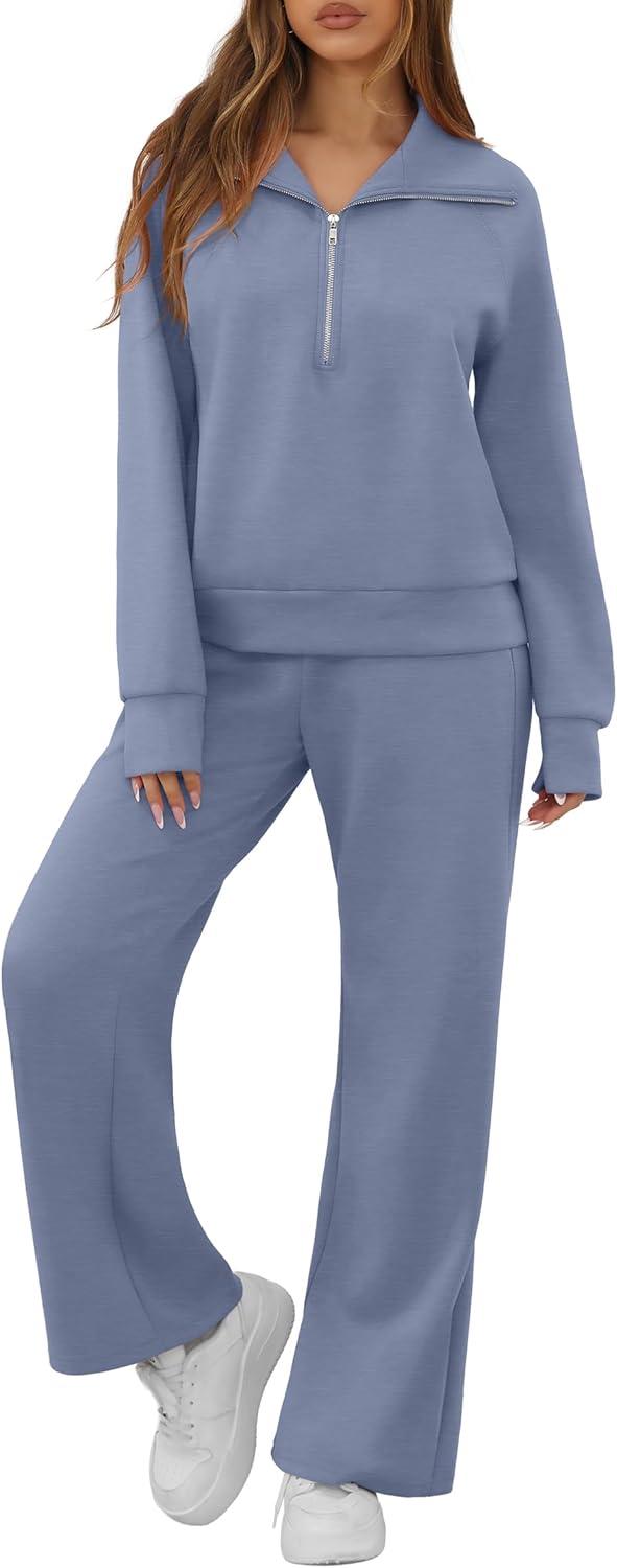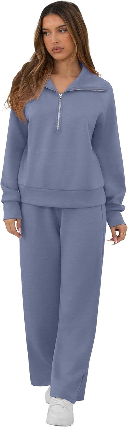 GRECERELLE Lounge Sets For Women 2025 Casual Lapel Half Zip Sweatshirt And Wide Leg Sweatpant 2 Piece Outfits Tracksuit Sets(Haze Blue)