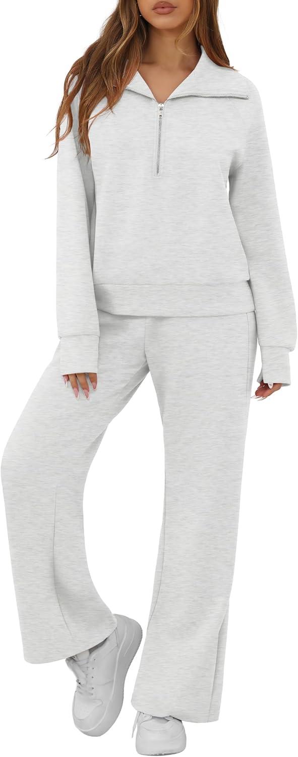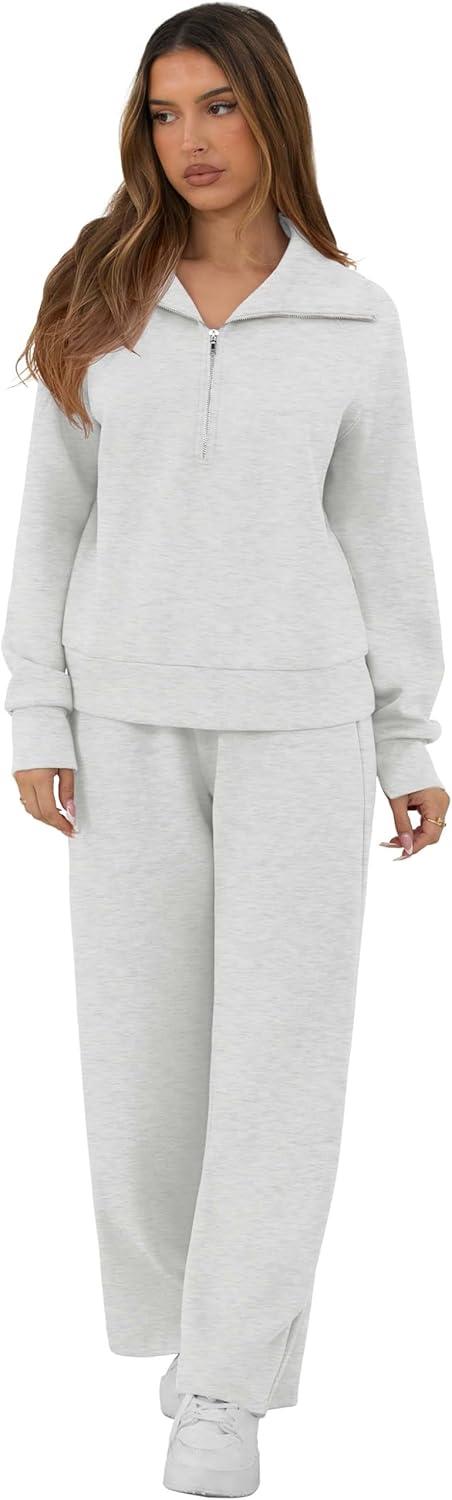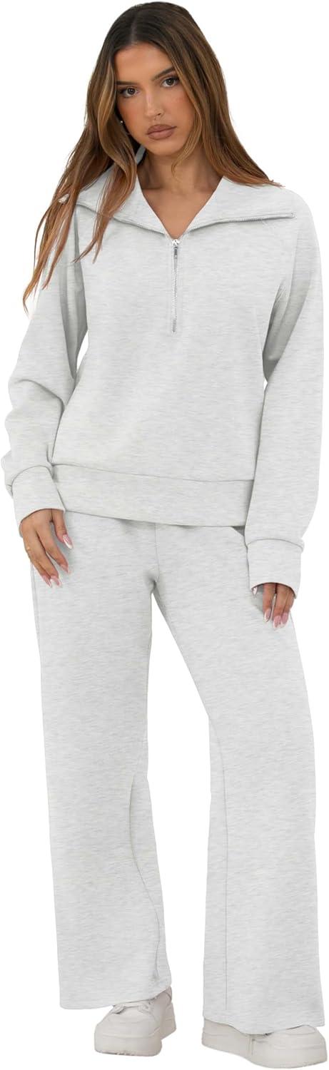 GRECERELLE Lounge Sets For Women 2025 Casual Lapel Half Zip Sweatshirt And Wide Leg Sweatpant 2 Piece Outfits Tracksuit Sets(Heather Grey)