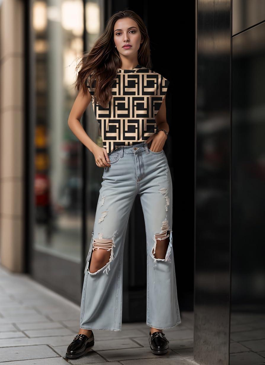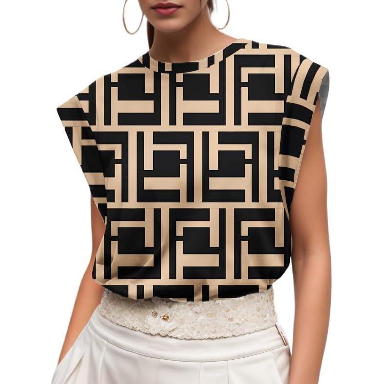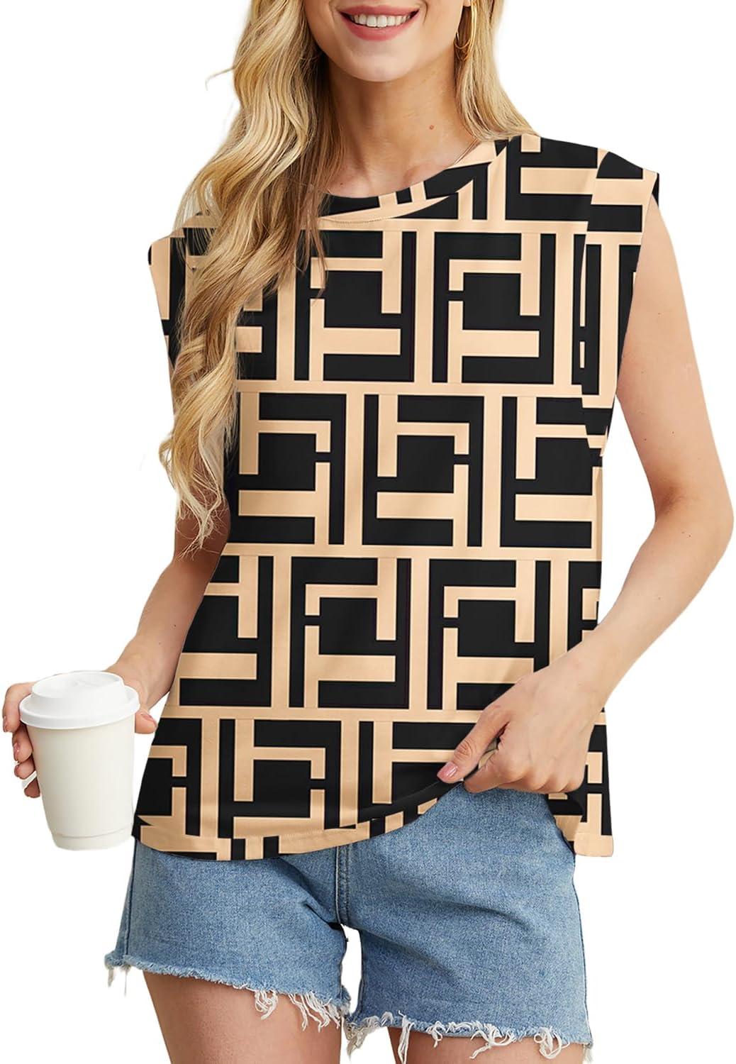 GRECERELLE Women 2025 Cap Sleeve Tops Summer Casual Tee Shirt Loose Crew Neck Basic Tank Trendy Work Vacation Outfits (S-2XL)(Black Puzzle)