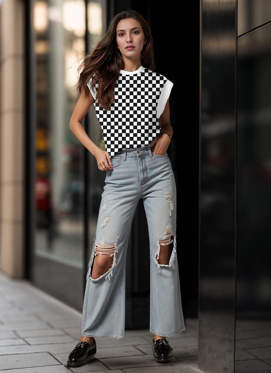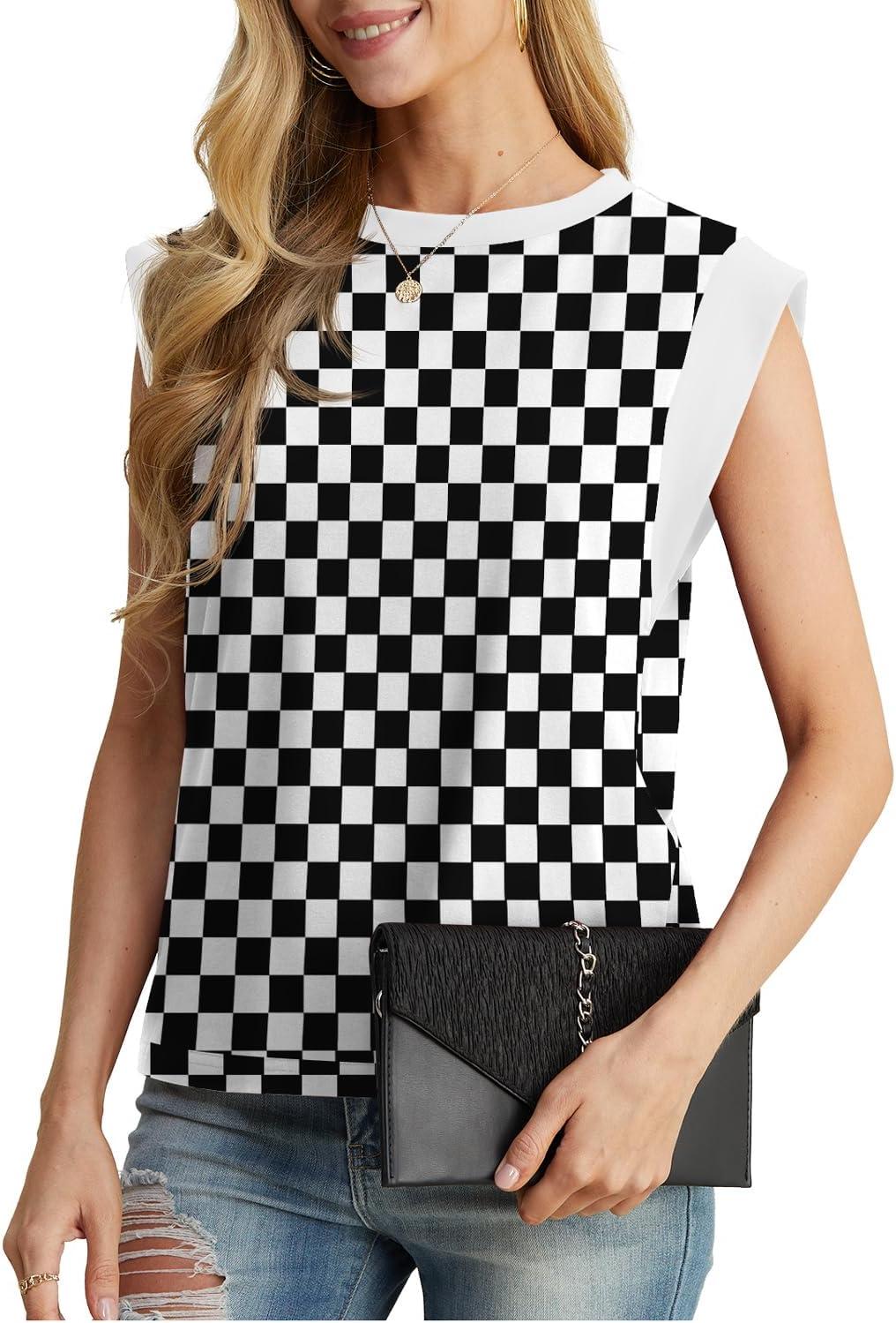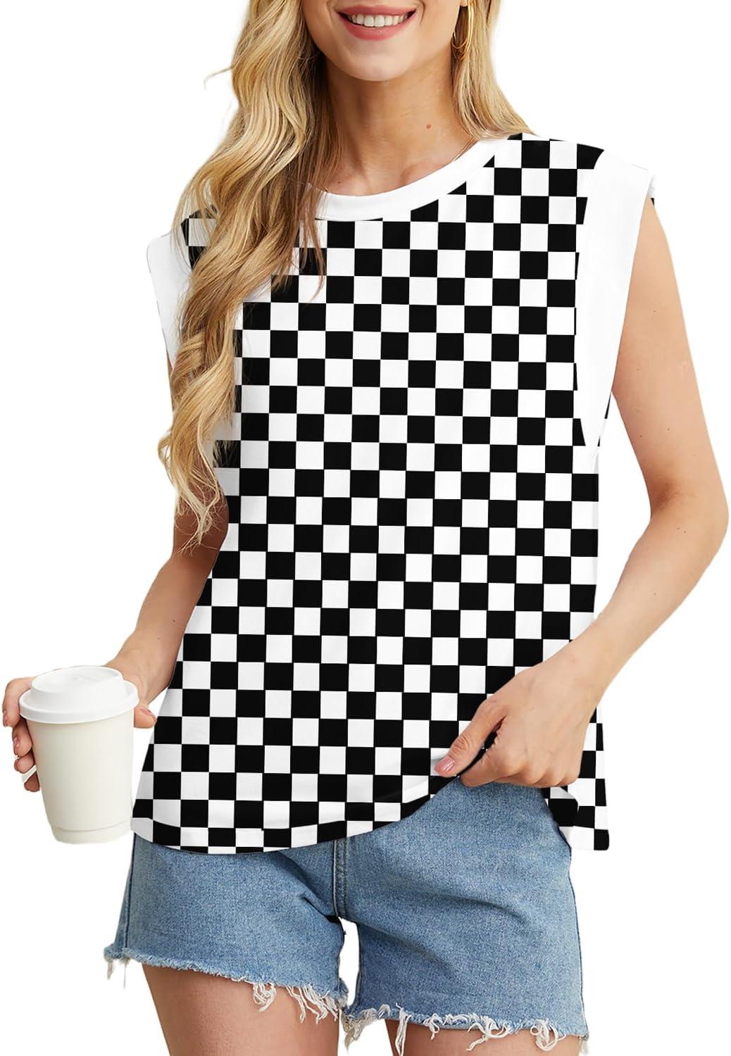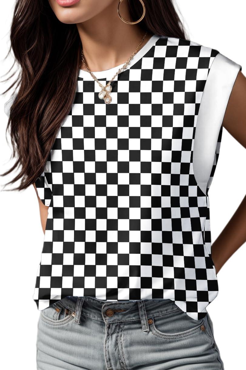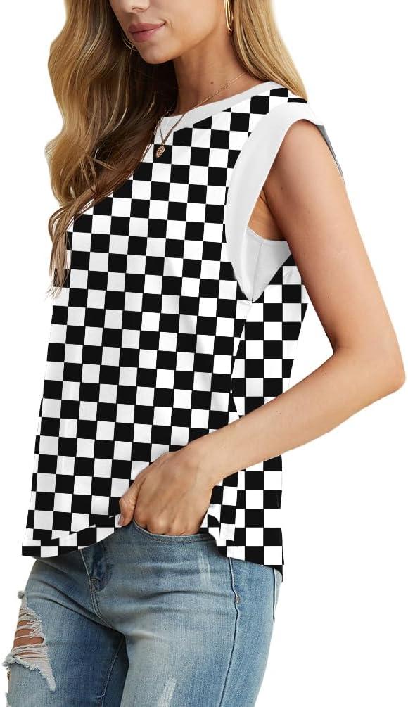 GRECERELLE Women 2025 Cap Sleeve Tops Summer Casual Tee Shirt Loose Crew Neck Basic Tank Trendy Work Vacation Outfits (S-2XL)(Black White Plaid)