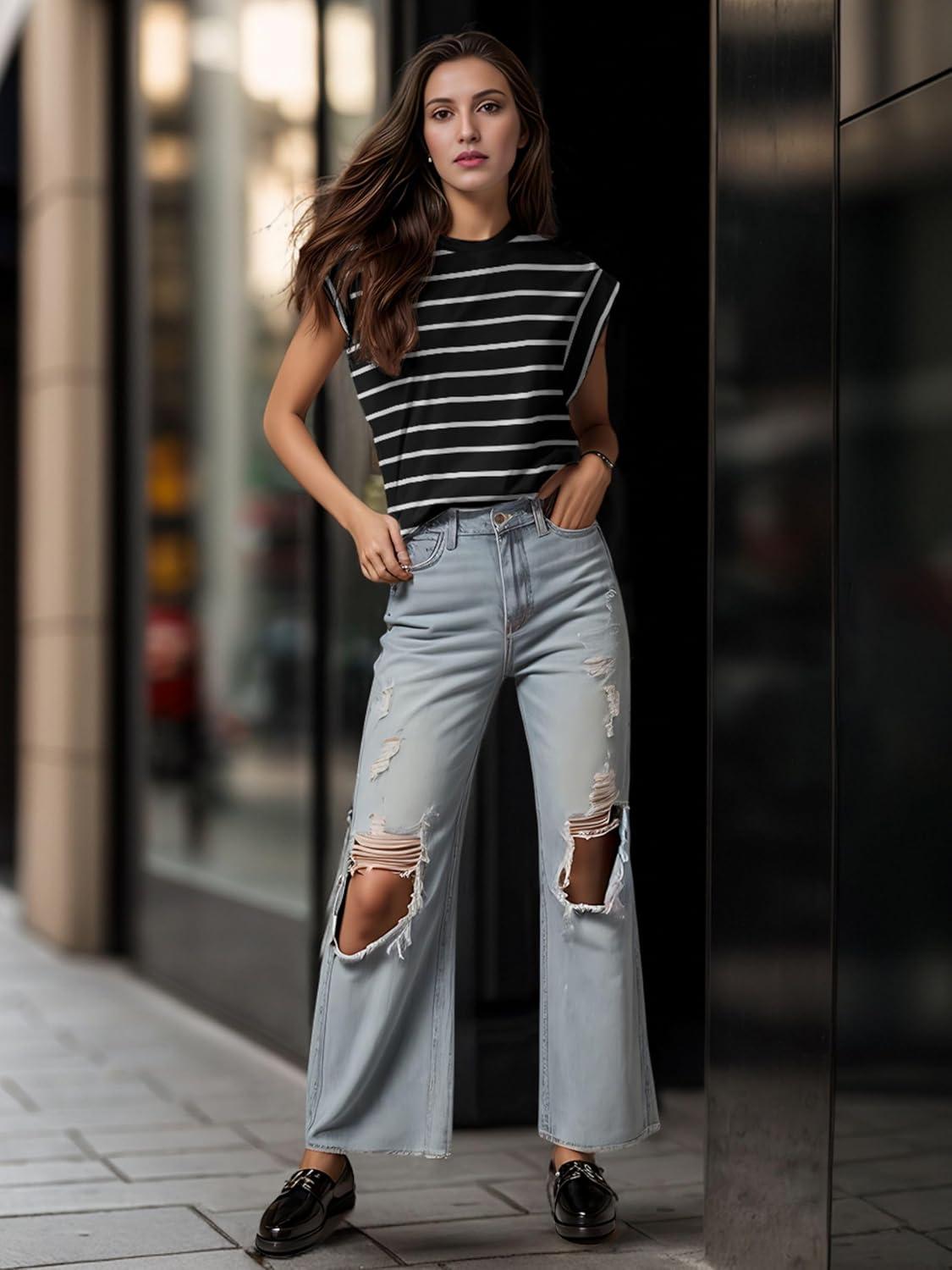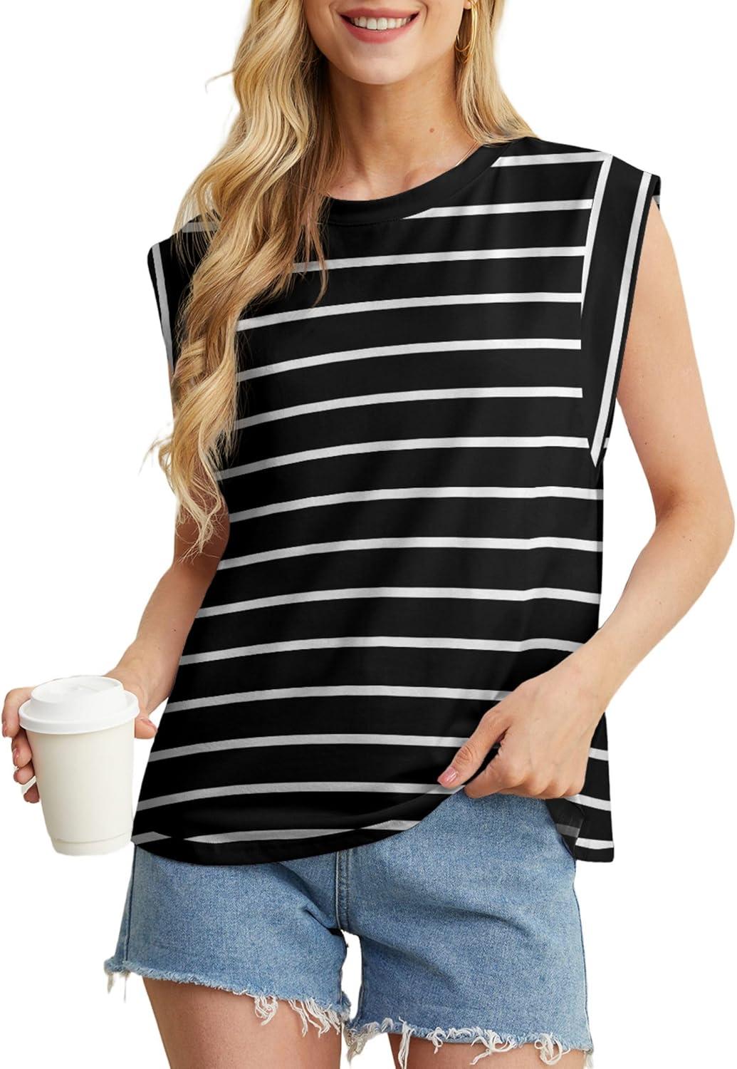 GRECERELLE Women 2025 Cap Sleeve Tops Summer Casual Tee Shirt Loose Crew Neck Basic Tank Trendy Work Vacation Outfits (S-2XL)(Black White Stripe)