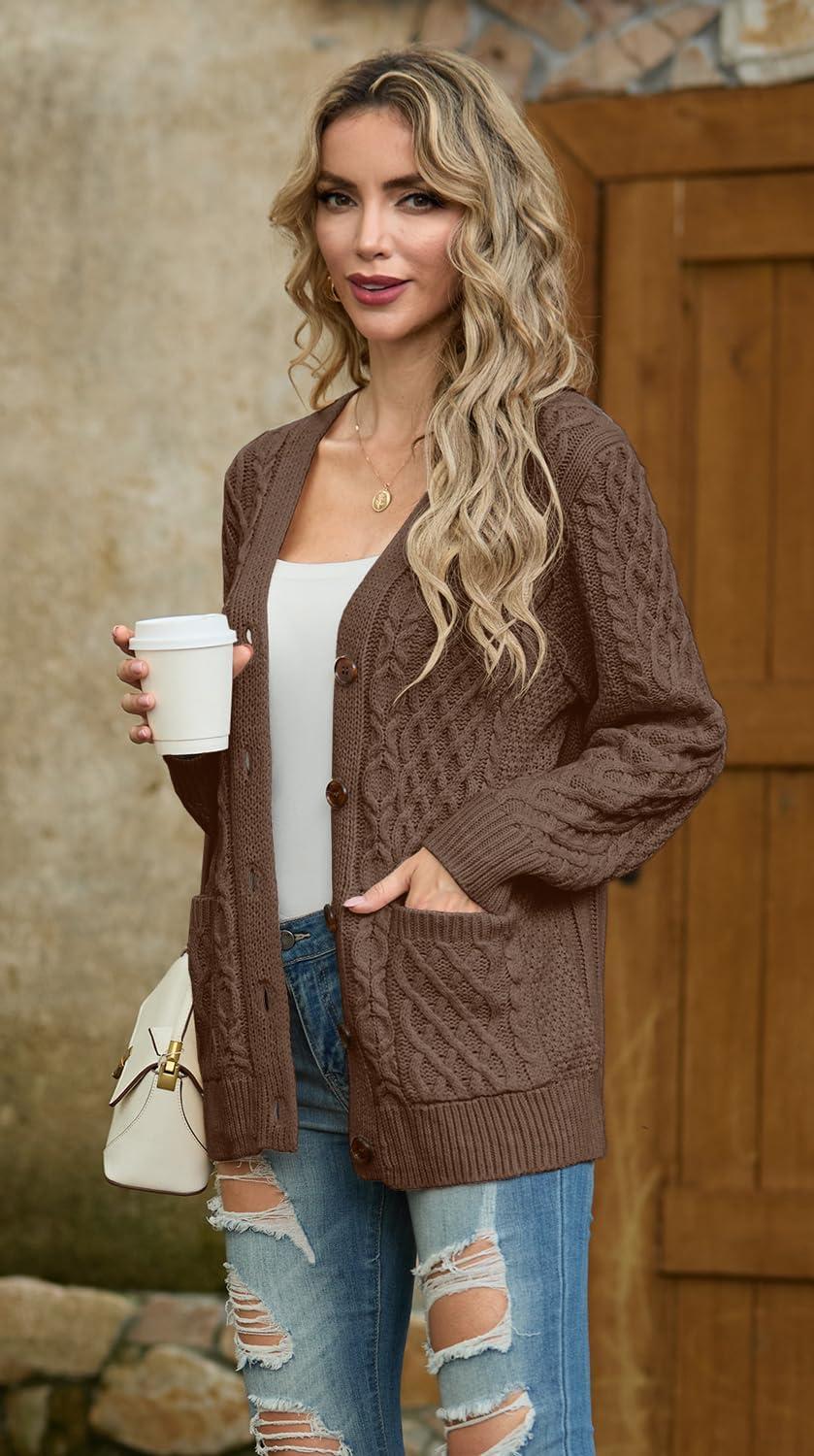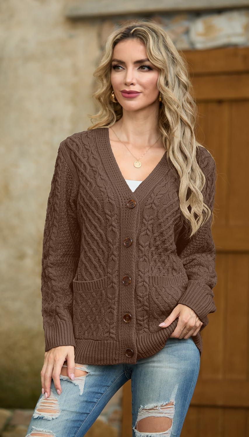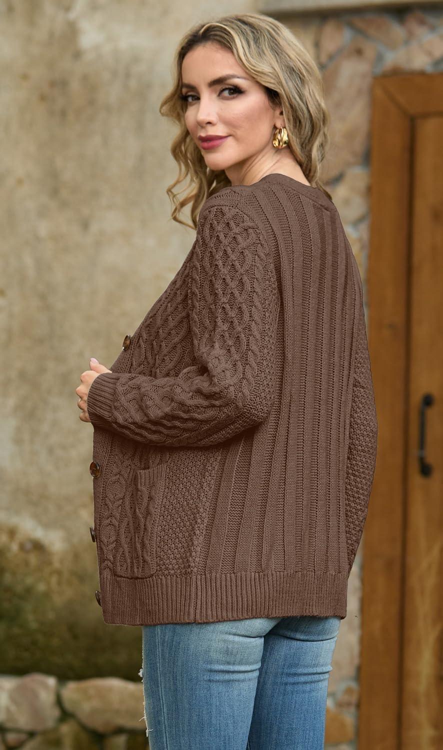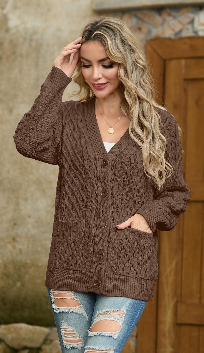 GRECERELLE Women 2025 Fall Long Sleeve Cable Knit Sweater Button Open Front Cardigan Loose Outerwear Coat with Pockets(Brown)