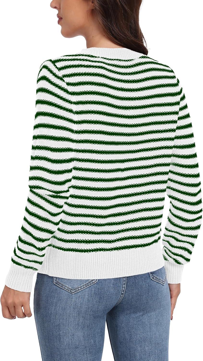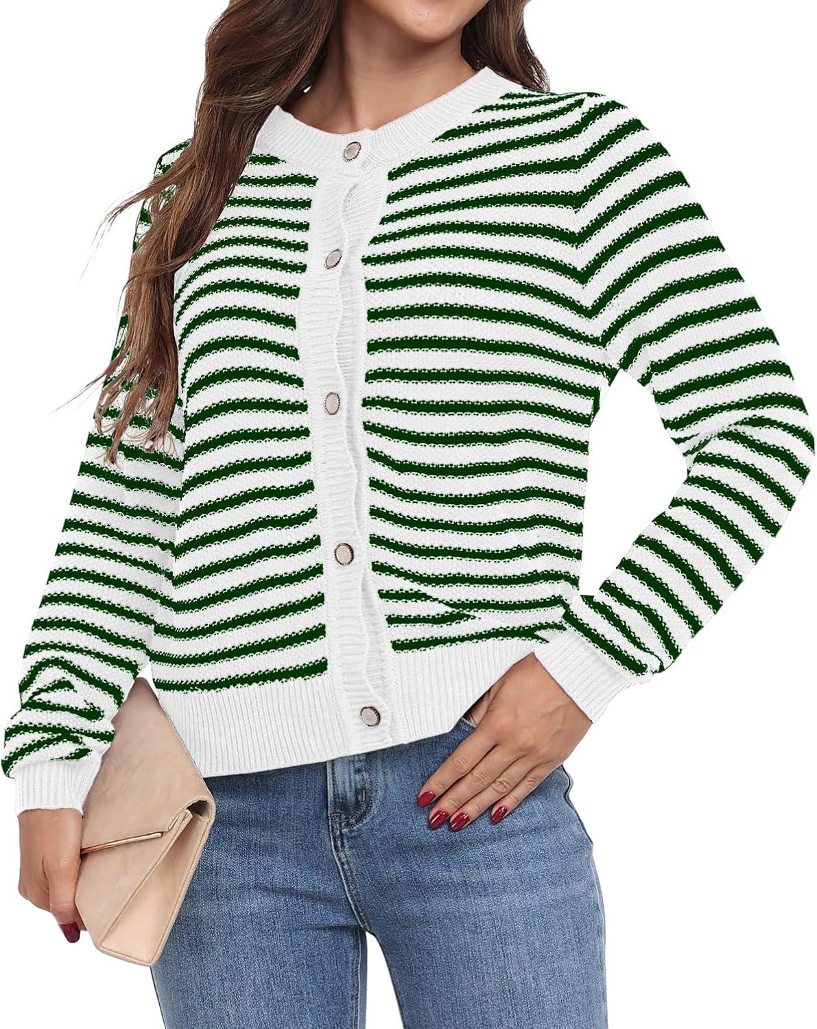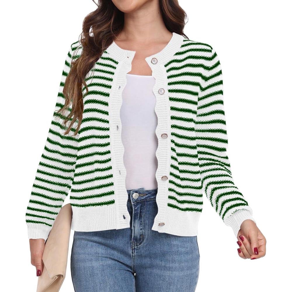 GRECERELLE Women Knit Cardigan Sweaters Long Sleeve Open Front Button Down Casual Trendy Jackets Outwear(Striped-white Dark Green)