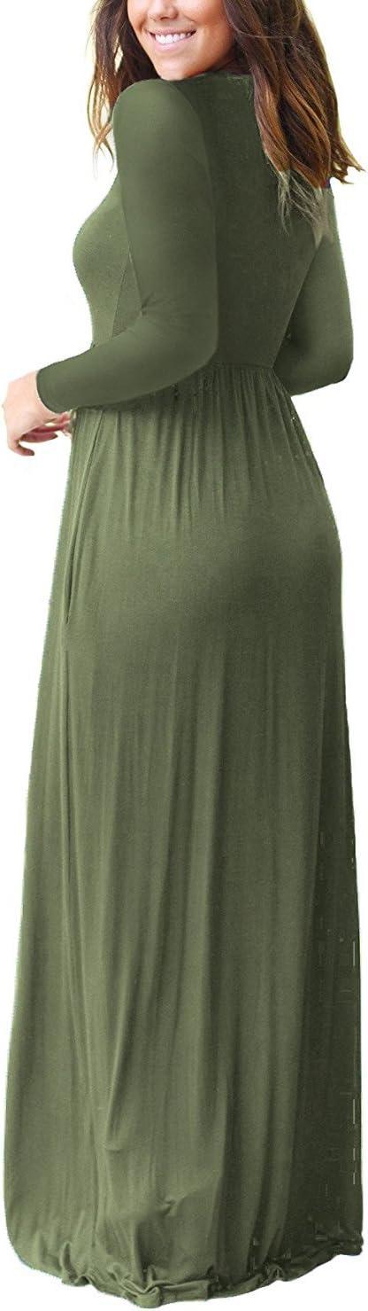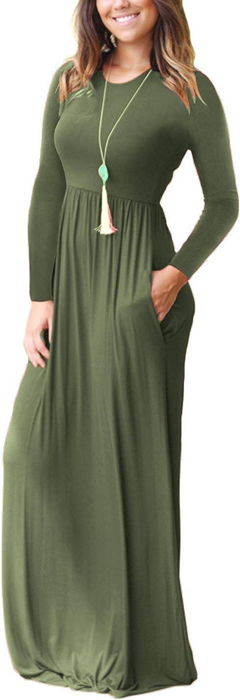 GRECERELLE Women Long Sleeve Casual Round Neck Loose Solid Floral Maxi Long Dress with Pockets, S-3XL(Army Green)