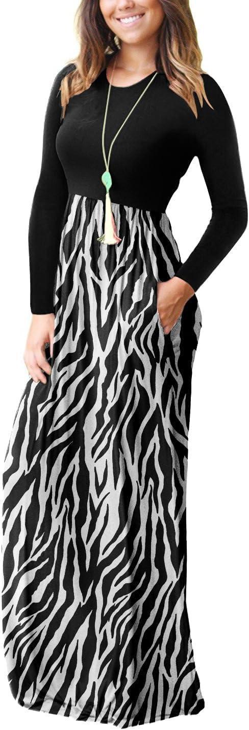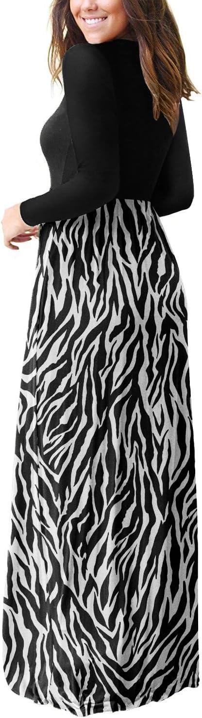 GRECERELLE Women Long Sleeve Casual Round Neck Loose Solid Floral Maxi Long Dress with Pockets, S-3XL(Black Tree Grain)