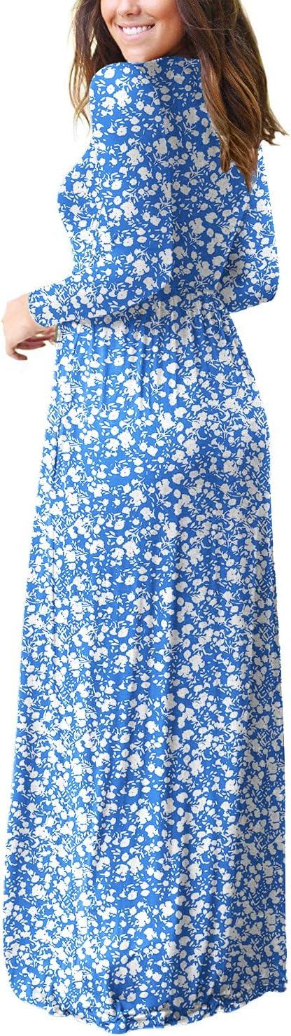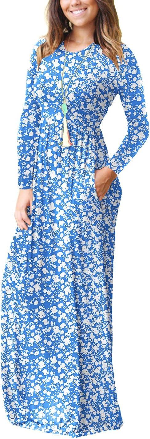 GRECERELLE Women Long Sleeve Casual Round Neck Loose Solid Floral Maxi Long Dress with Pockets, S-3XL(Blue Flowers White)