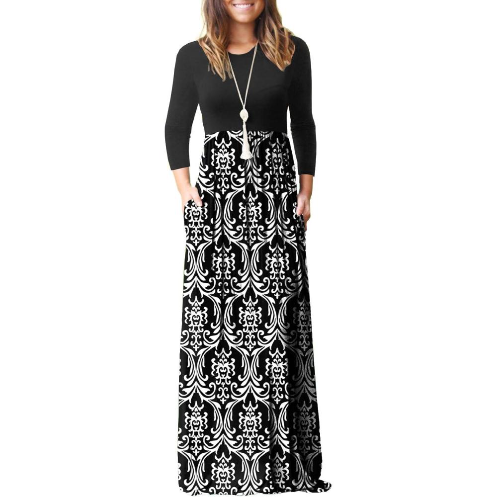 GRECERELLE Women Long Sleeve Casual Round Neck Loose Solid Floral Maxi Long Dress with Pockets, S-3XL(Flowers Black White)