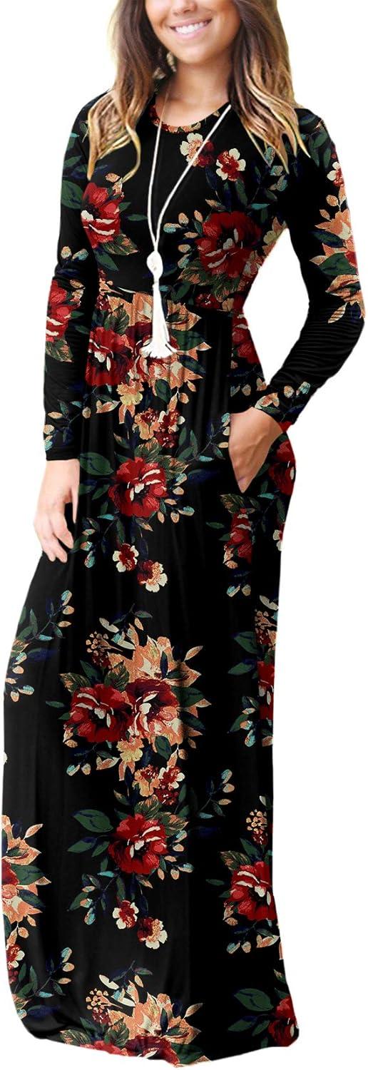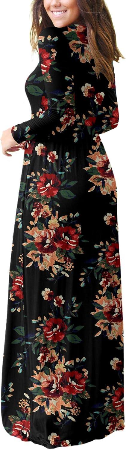GRECERELLE Women Long Sleeve Casual Round Neck Loose Solid Floral Maxi Long Dress with Pockets, S-3XL(Flowers Brown Black)