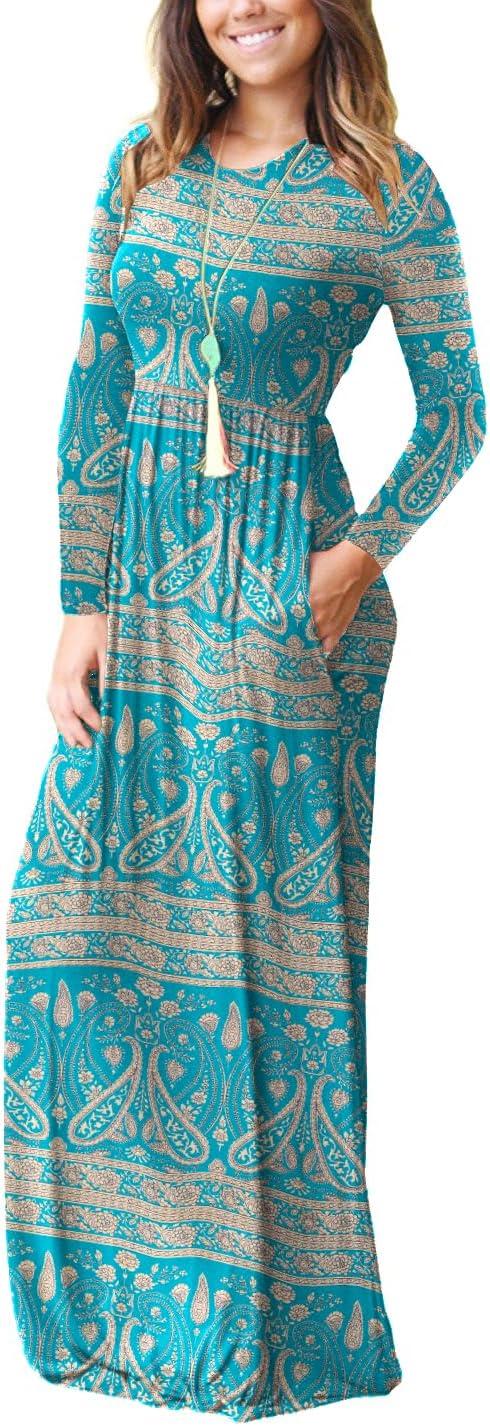 GRECERELLE Women Long Sleeve Casual Round Neck Loose Solid Floral Maxi Long Dress with Pockets, S-3XL(Green Khaki)