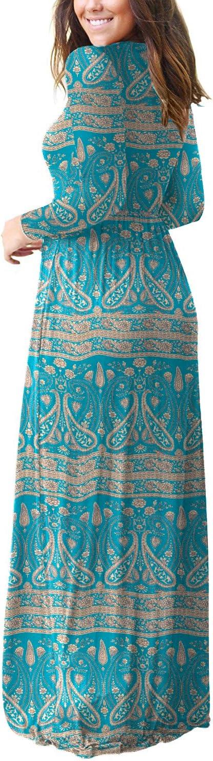 GRECERELLE Women Long Sleeve Casual Round Neck Loose Solid Floral Maxi Long Dress with Pockets, S-3XL(Khaki Love)