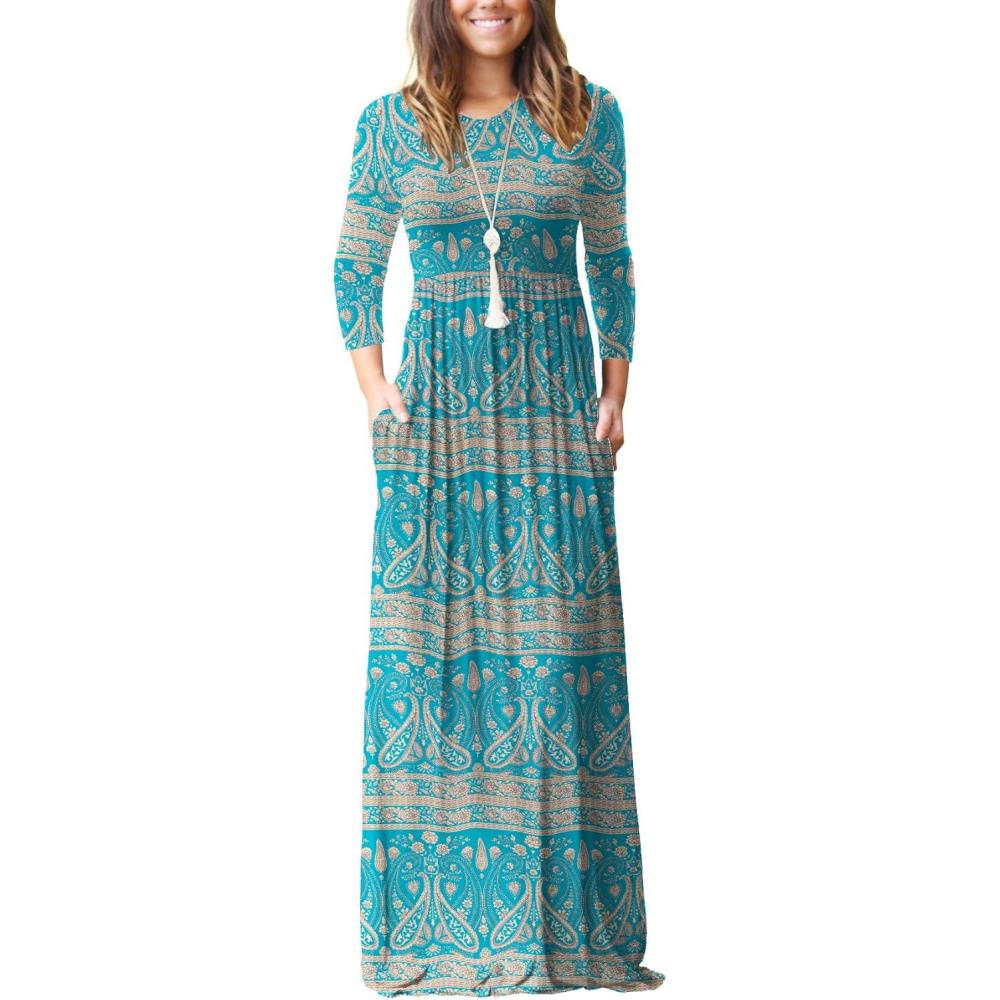 GRECERELLE Women Long Sleeve Casual Round Neck Loose Solid Floral Maxi Long Dress with Pockets, S-3XL(Gray)