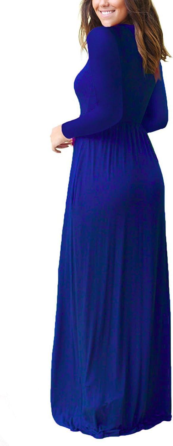 GRECERELLE Women Long Sleeve Casual Round Neck Loose Solid Floral Maxi Long Dress with Pockets, S-3XL(Royal Blue)