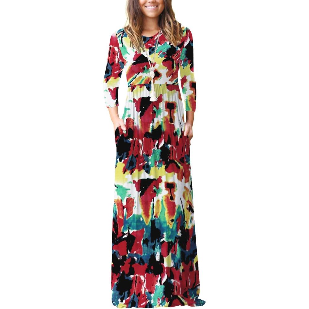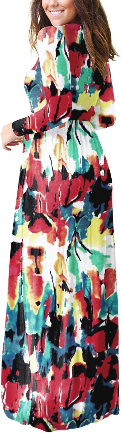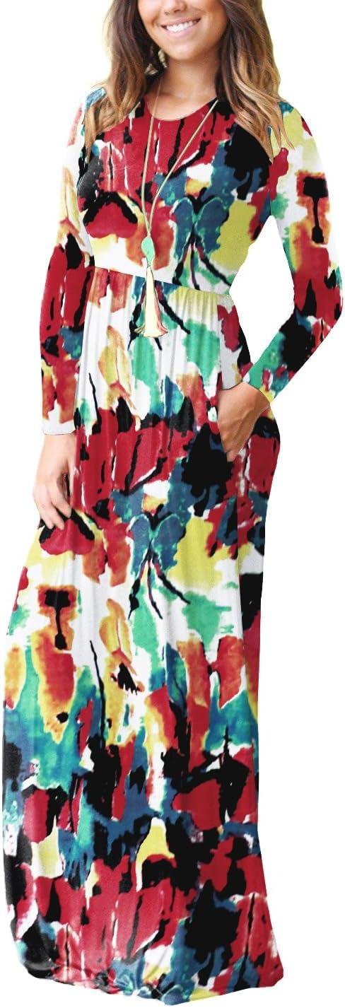 GRECERELLE Women Long Sleeve Casual Round Neck Loose Solid Floral Maxi Long Dress with Pockets, S-3XL(White Ink Red)