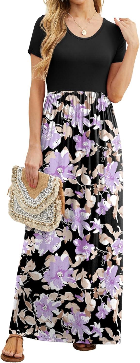 GRECERELLE Women Summer Crew Neck Casual Short Sleeve Solid Floral Print Long Maxi Dress with Pockets(Black Purple Bloom)