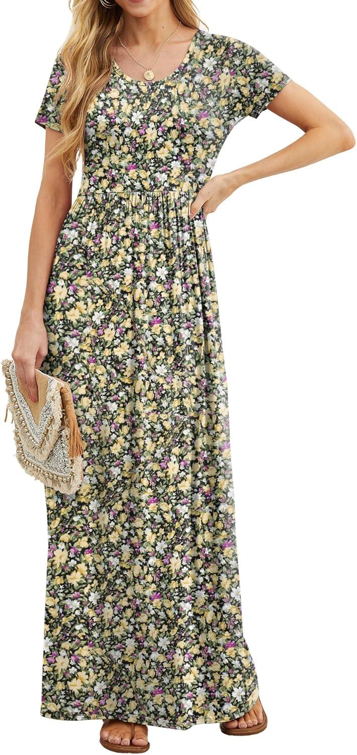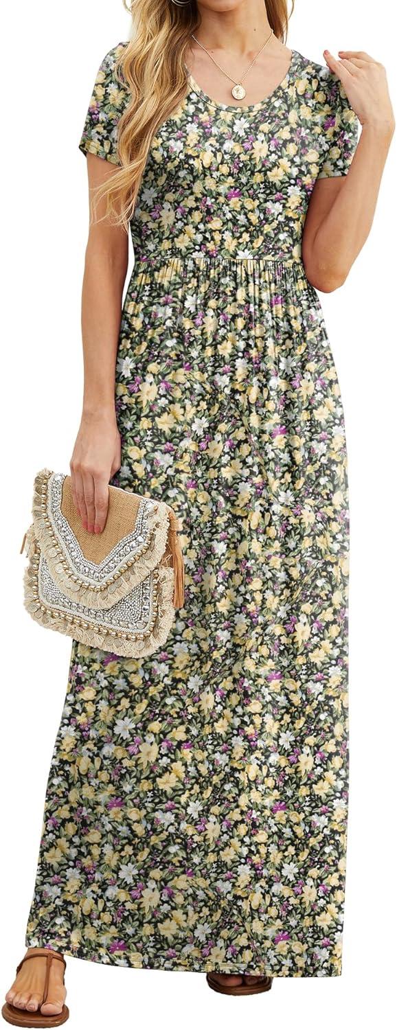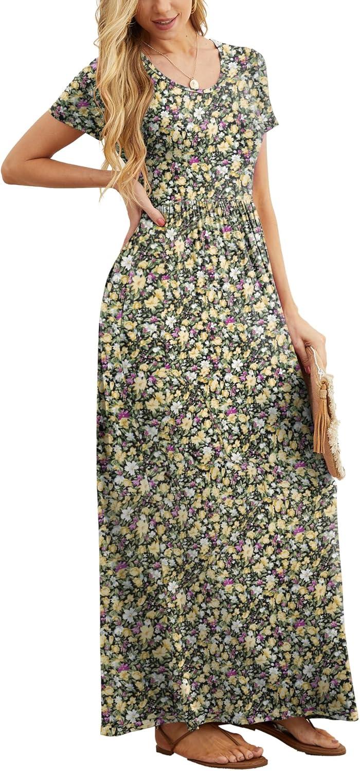 GRECERELLE Women Summer Crew Neck Casual Short Sleeve Solid Floral Print Long Maxi Dress with Pockets(Black Yellow Floral)
