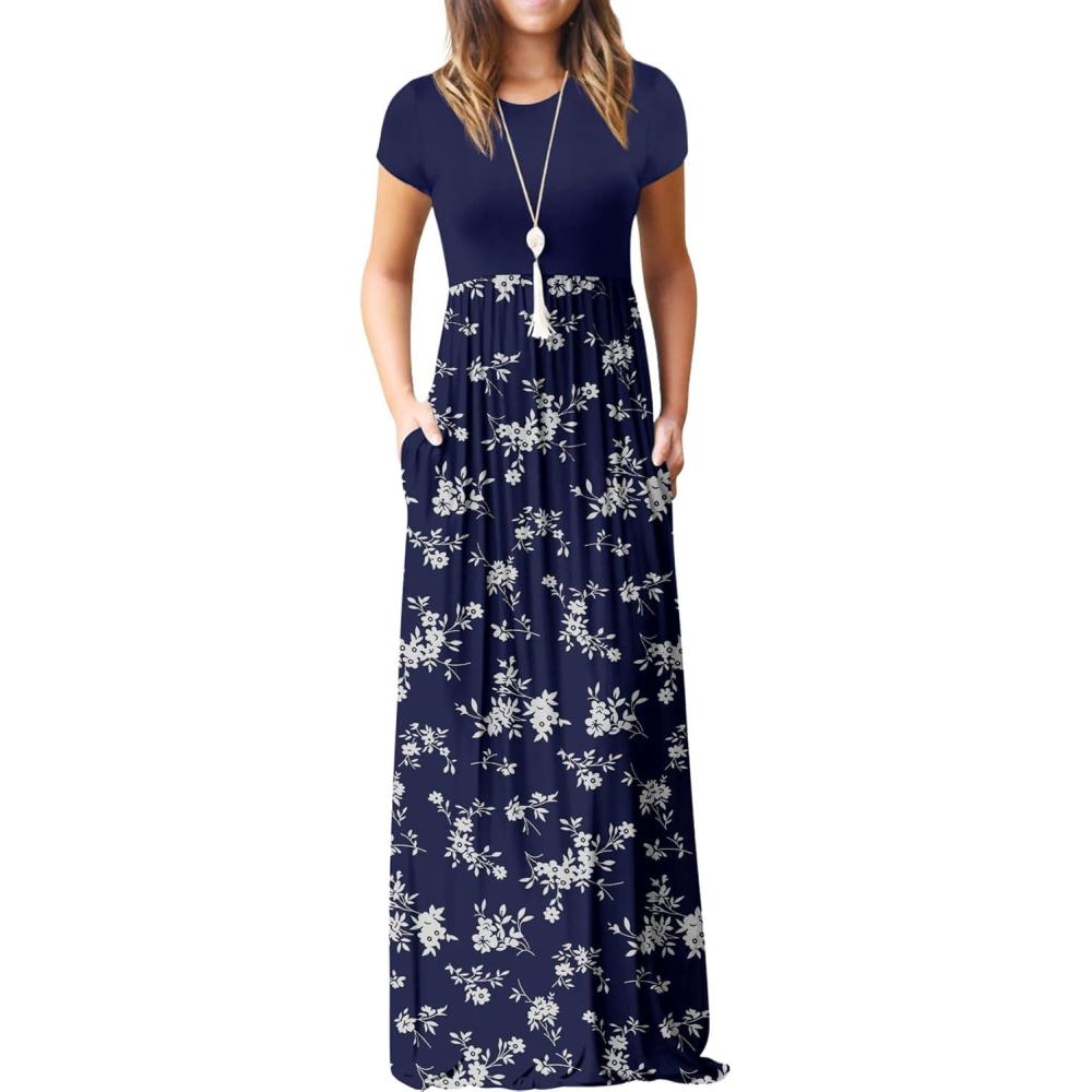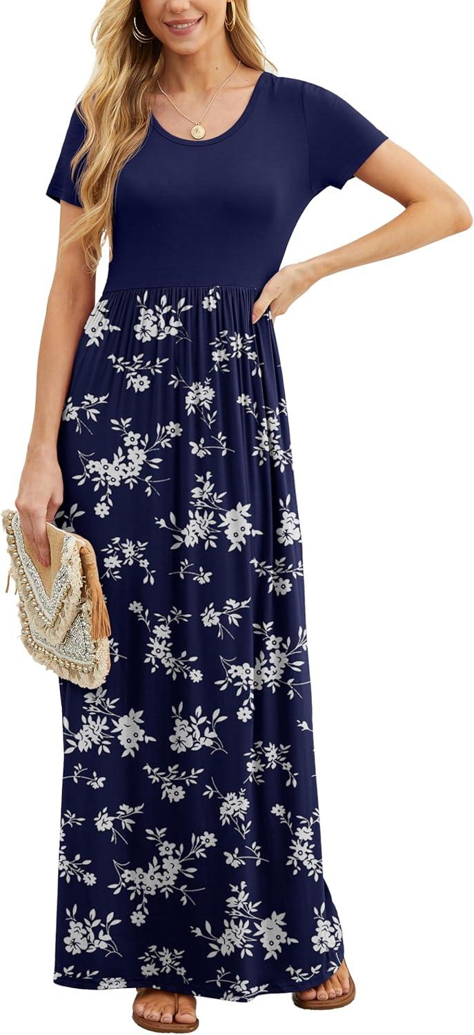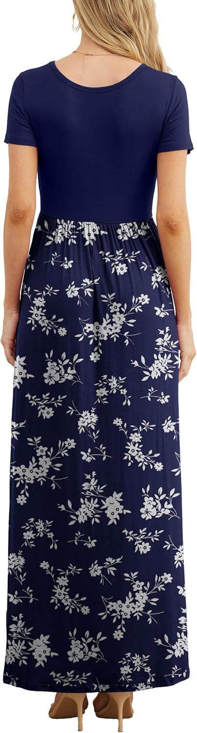 GRECERELLE Women Summer Crew Neck Casual Short Sleeve Solid Floral Print Long Maxi Dress with Pockets(Blue Small Flower)
