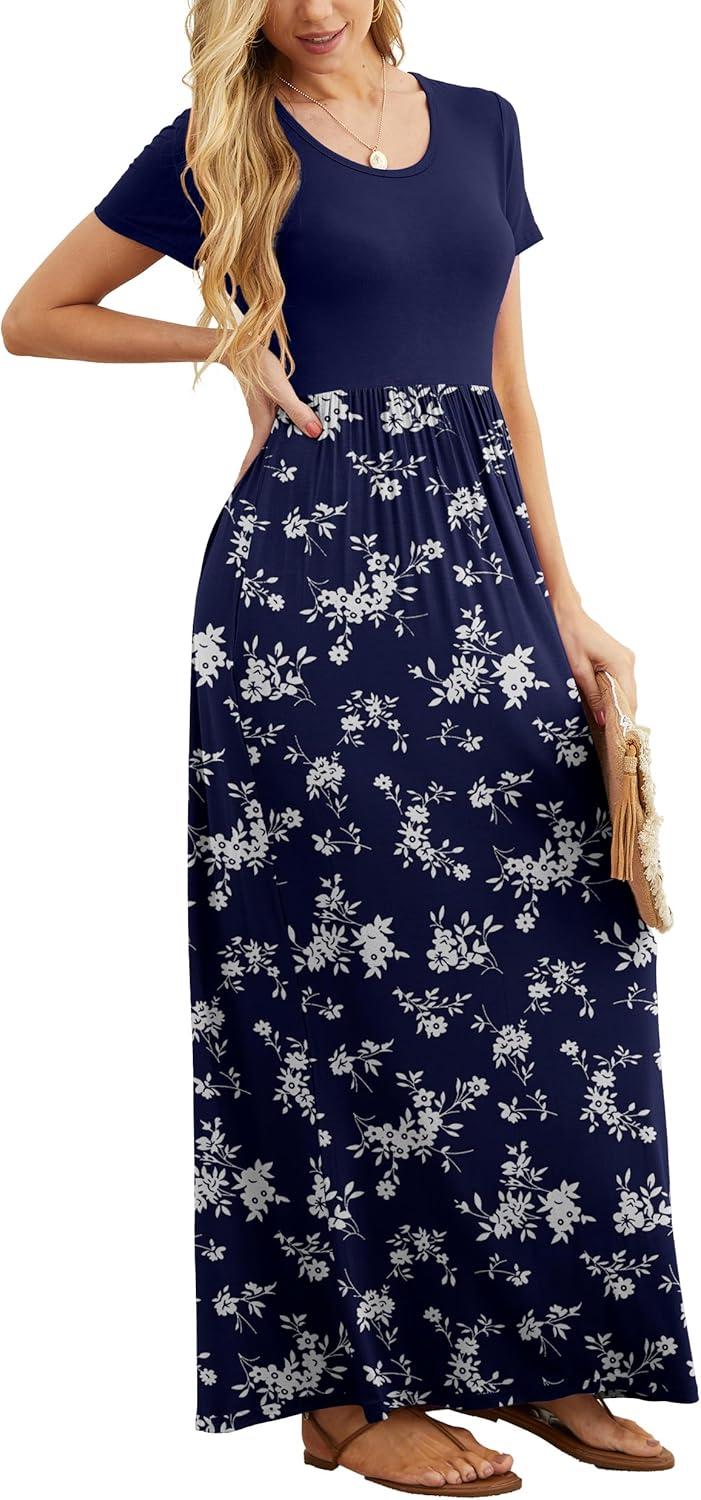 imageGRECERELLE Women Summer Crew Neck Casual Short Sleeve Solid Floral Print Long Maxi Dress with PocketsBlue Small Flower