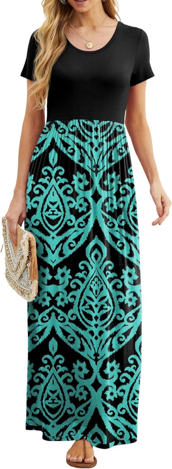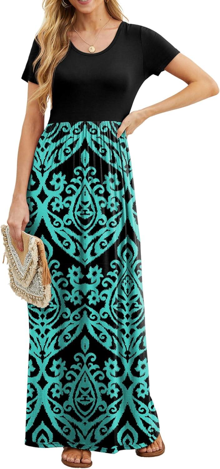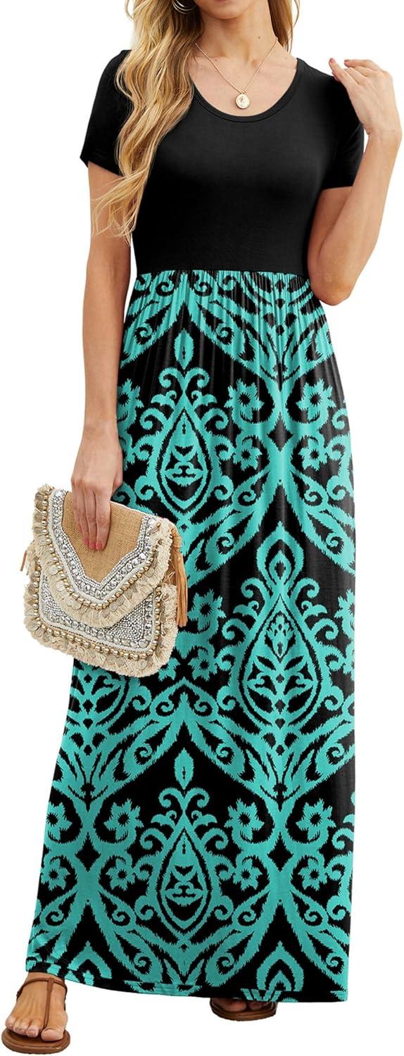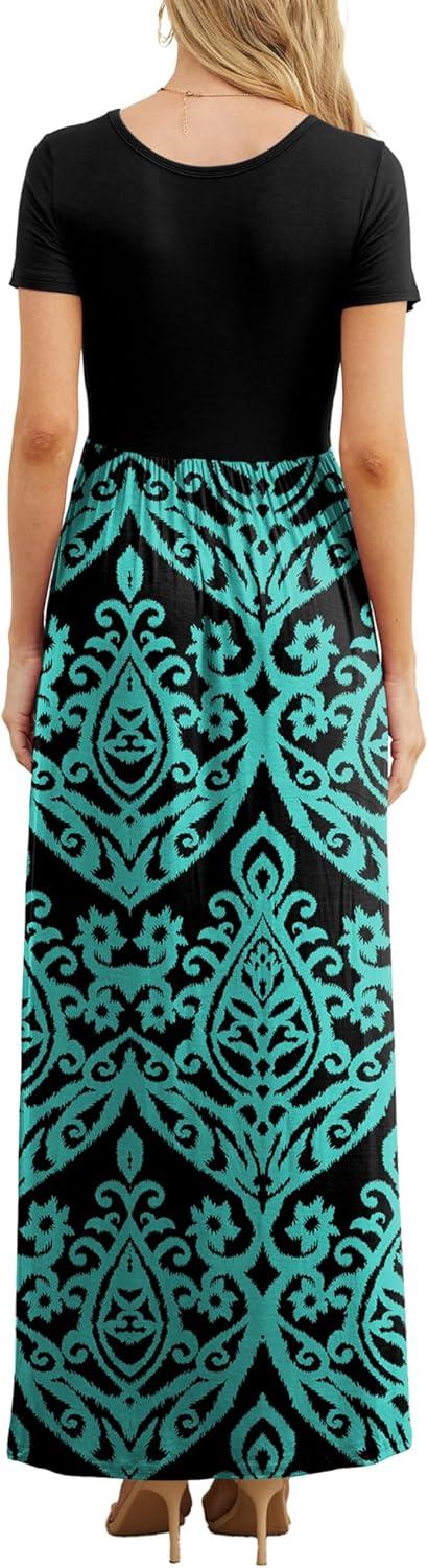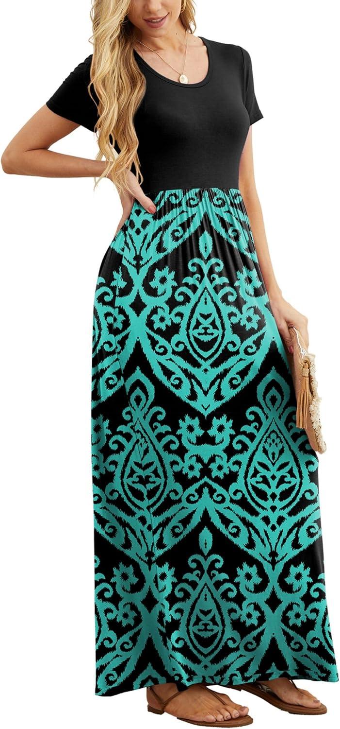 GRECERELLE Women Summer Crew Neck Casual Short Sleeve Solid Floral Print Long Maxi Dress with Pockets(Flower-blue Green)