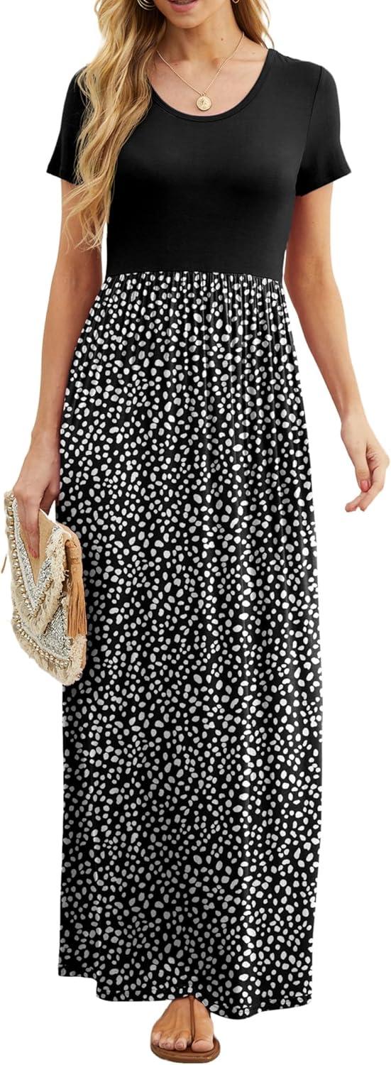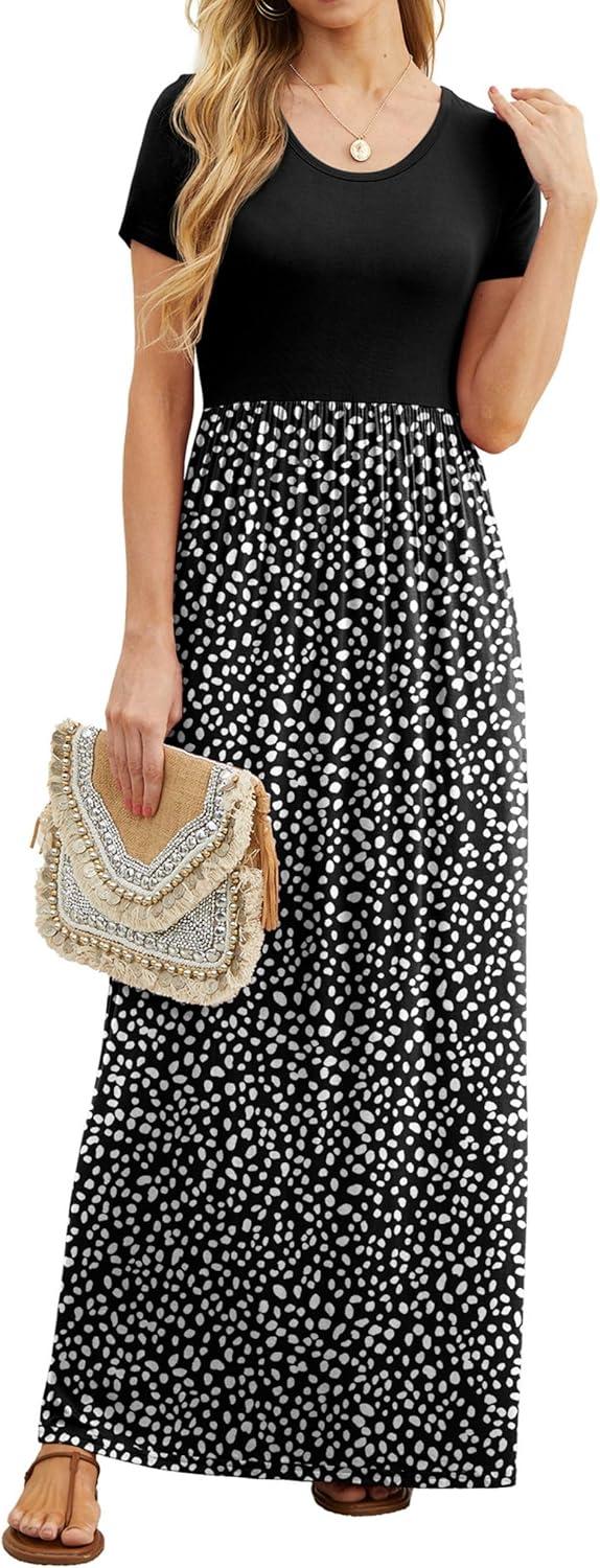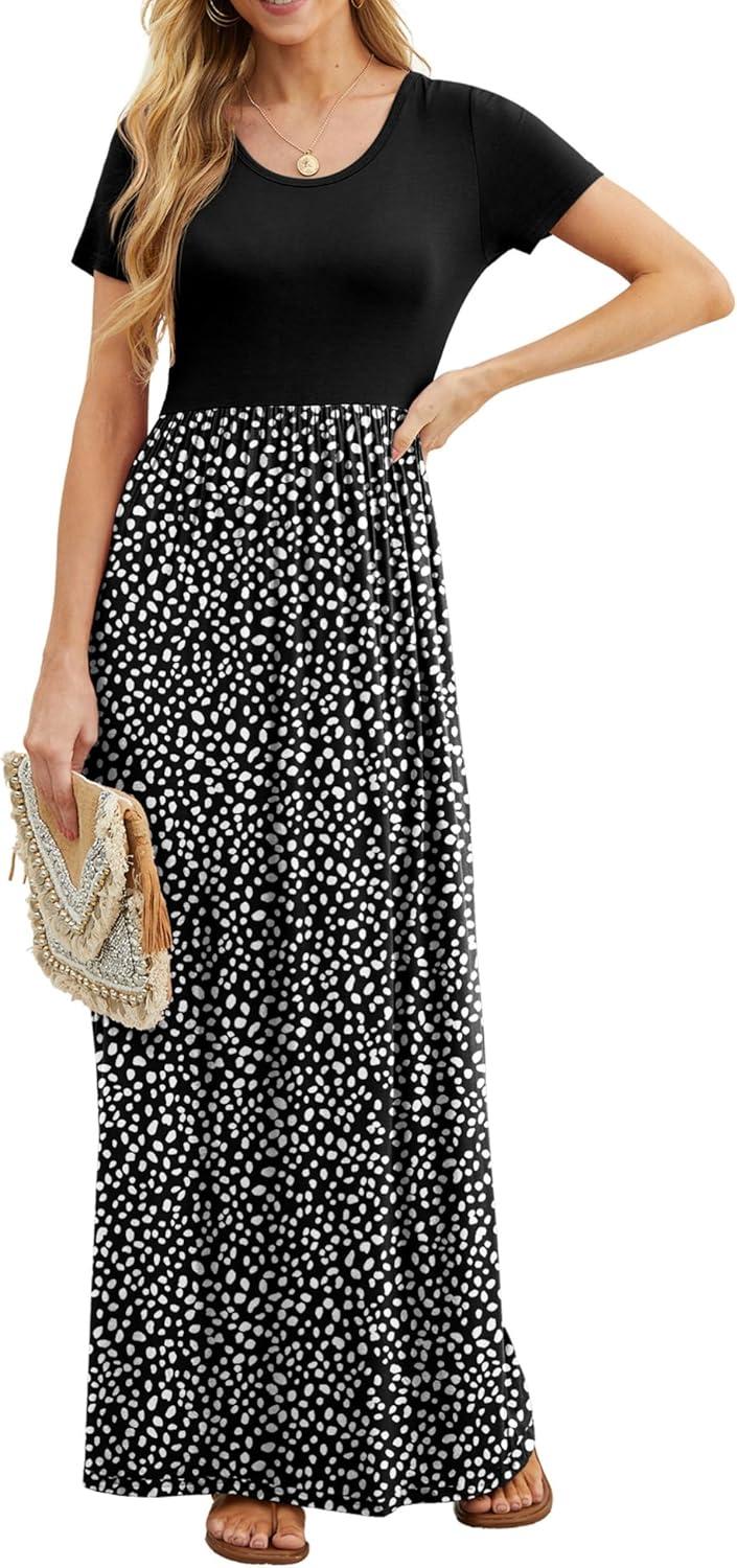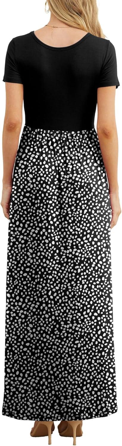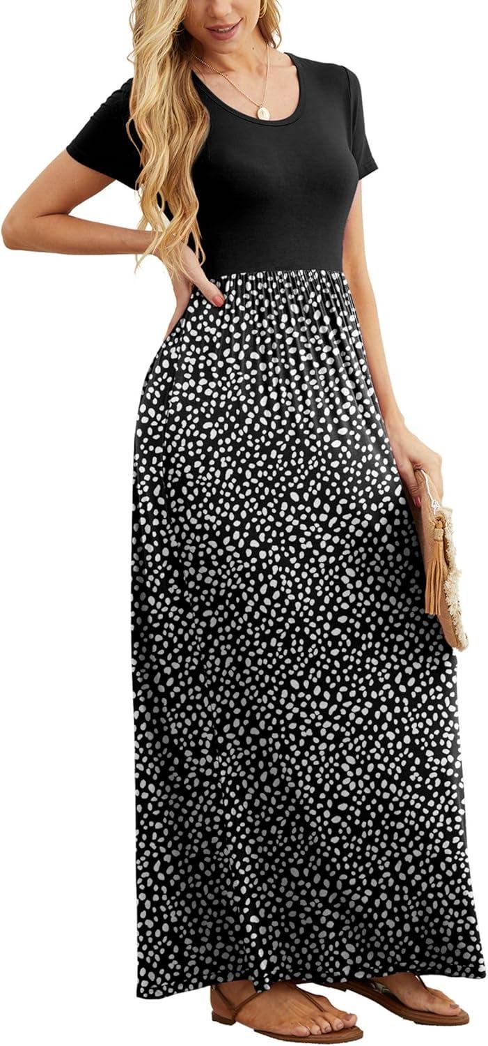 GRECERELLE Women Summer Crew Neck Casual Short Sleeve Solid Floral Print Long Maxi Dress with Pockets(Leopard Print Black)