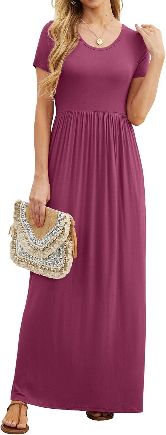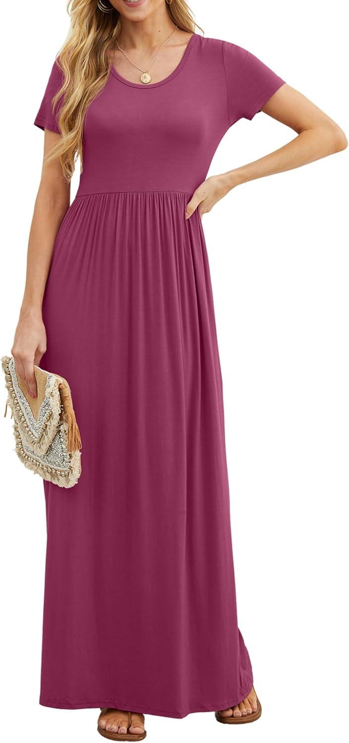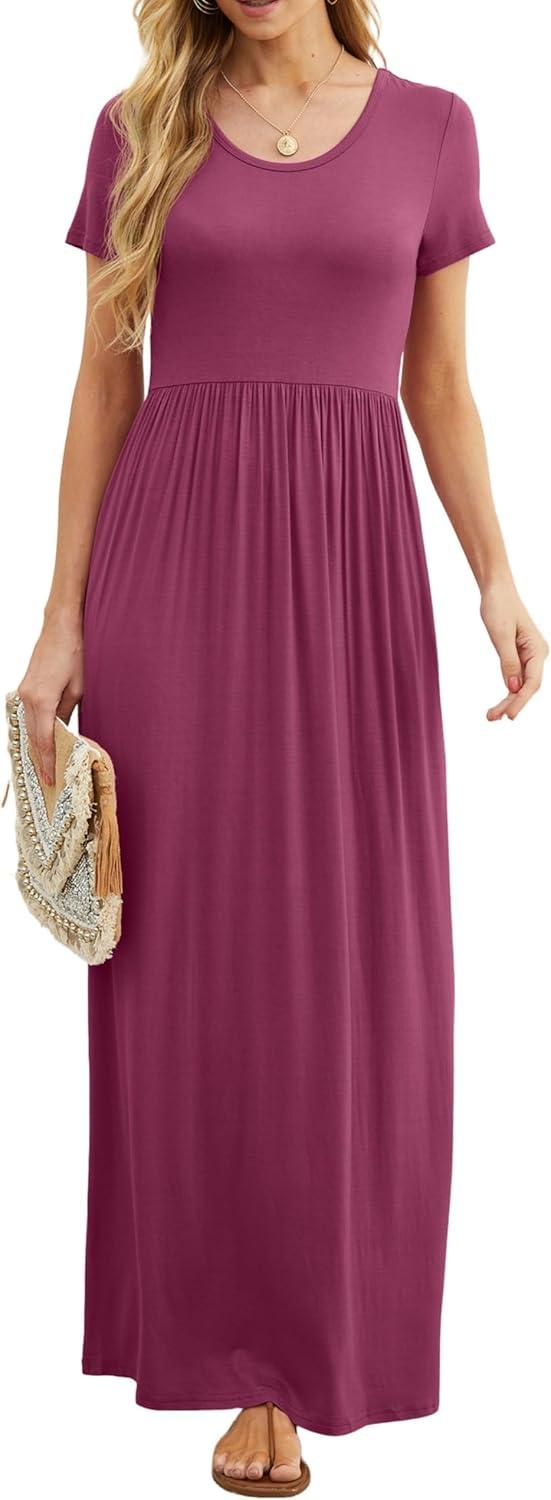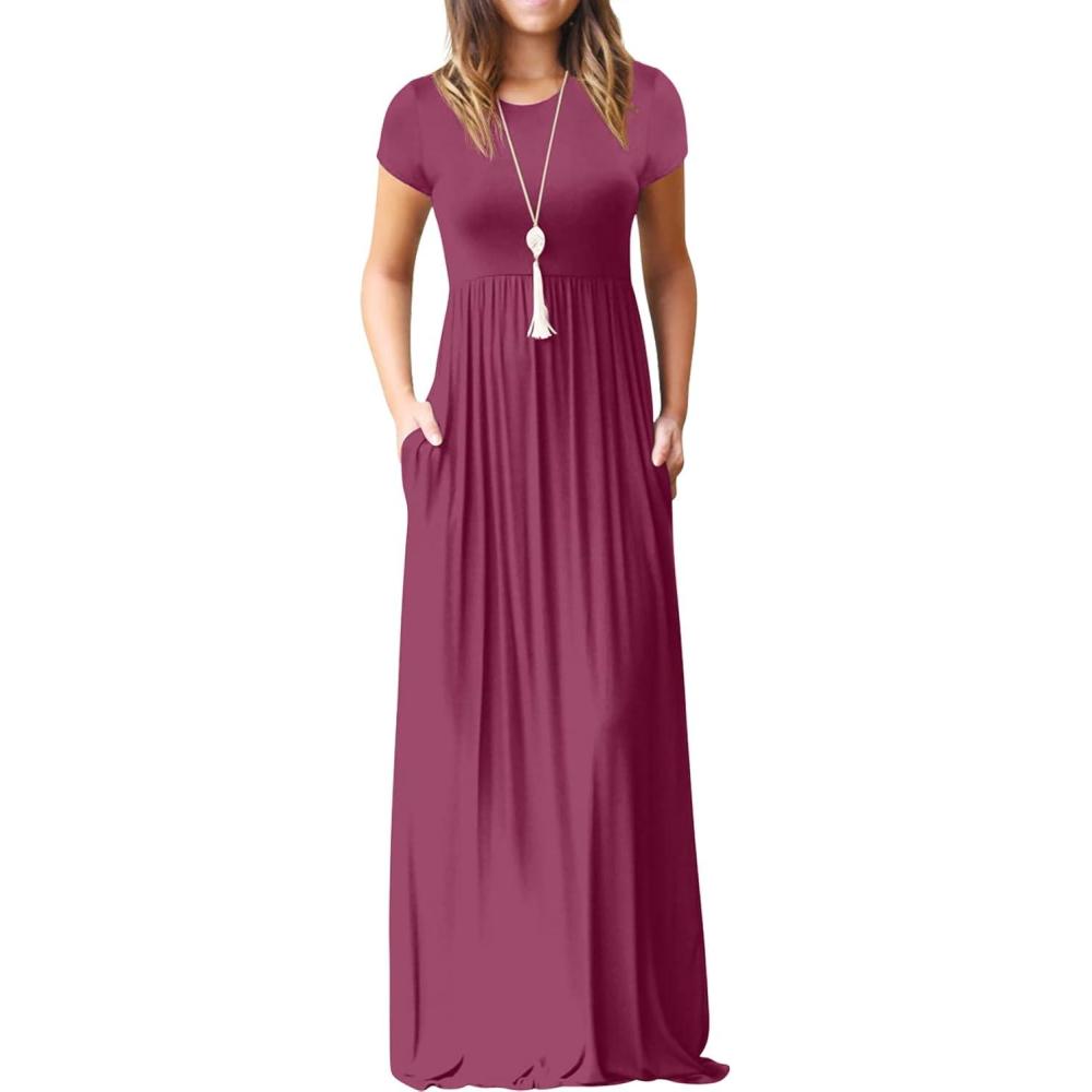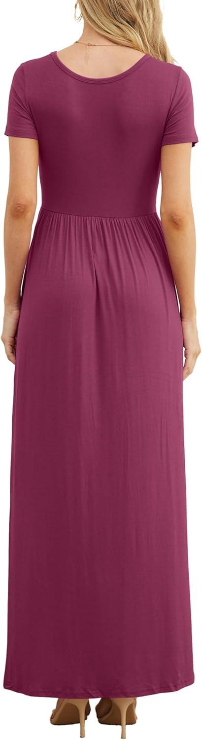GRECERELLE Women Summer Crew Neck Casual Short Sleeve Solid Floral Print Long Maxi Dress with Pockets(Red Gray)