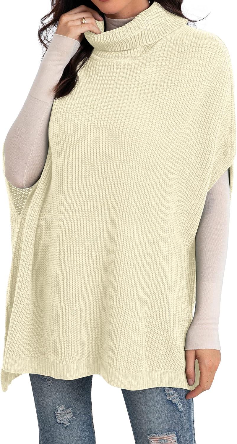 GRECERELLE Women Turtleneck Oversized Knit Batwing Sleeveless Loose High Low Hem Side Slit Pullover Sweater(11 Cream White)