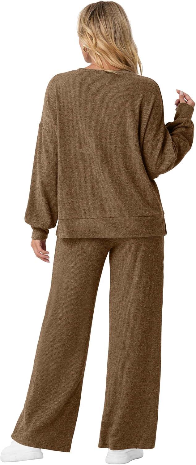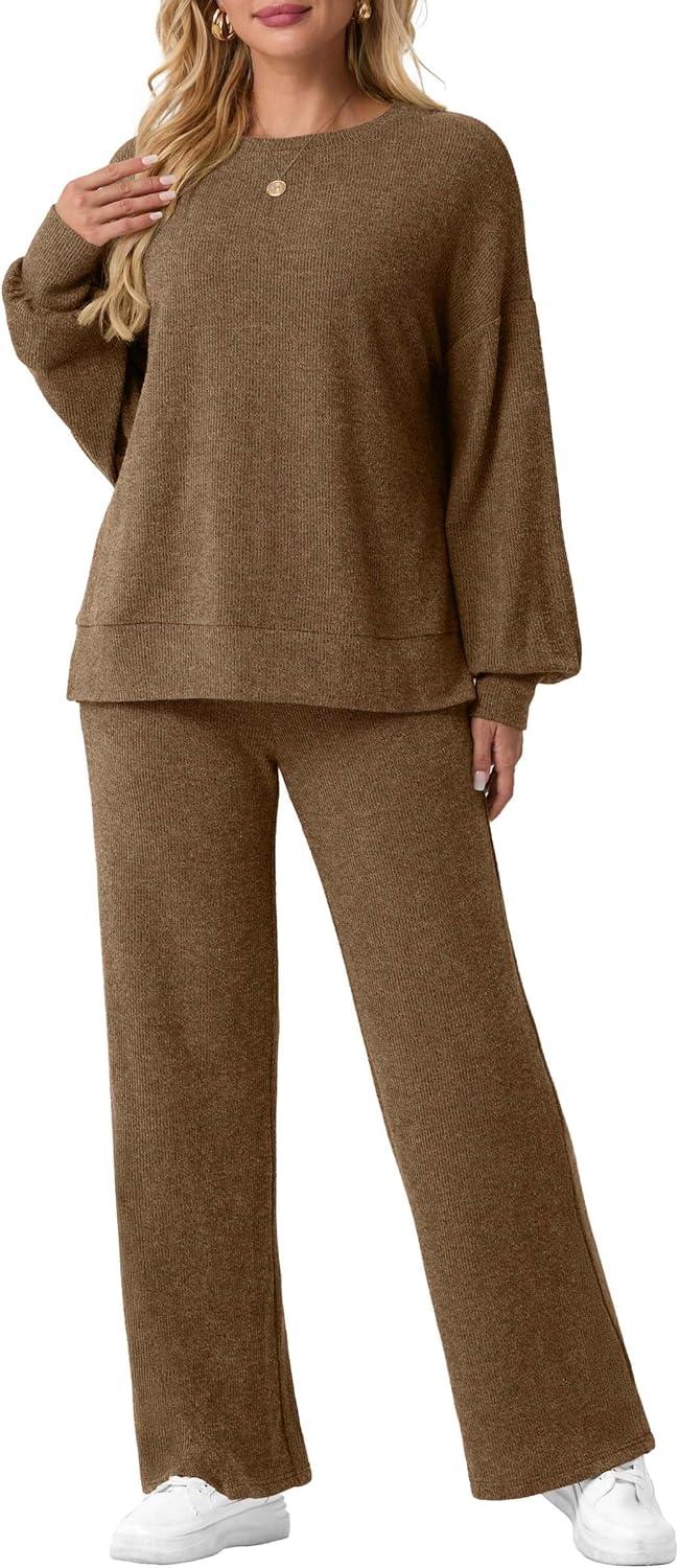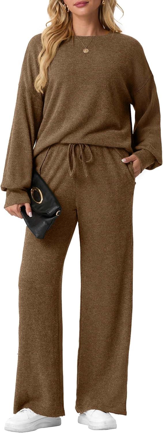 GRECERELLE Women's 2 Piece Outfits Winter 2025 Oversized Chunky Knit Sweater Top And Wide Leg Pants Lounge Set Sweatsuit(Tan)