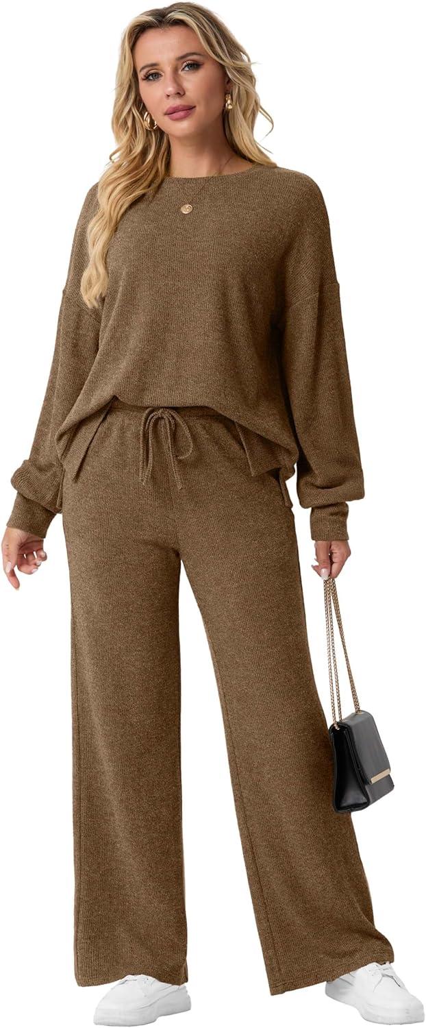 GRECERELLE Women’s 2 Piece Outfits Winter 2025 Oversized Chunky Knit Sweater Top And Wide Leg Pants Lounge Set Sweatsuit(Tan)