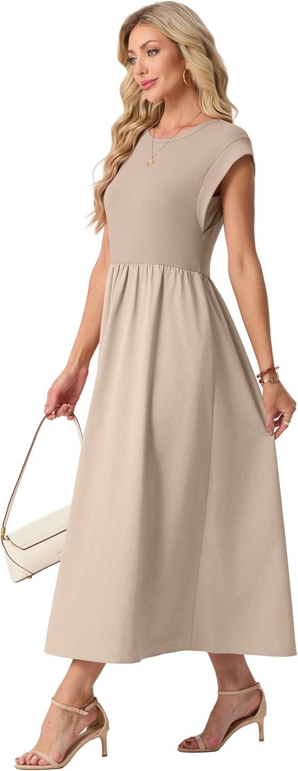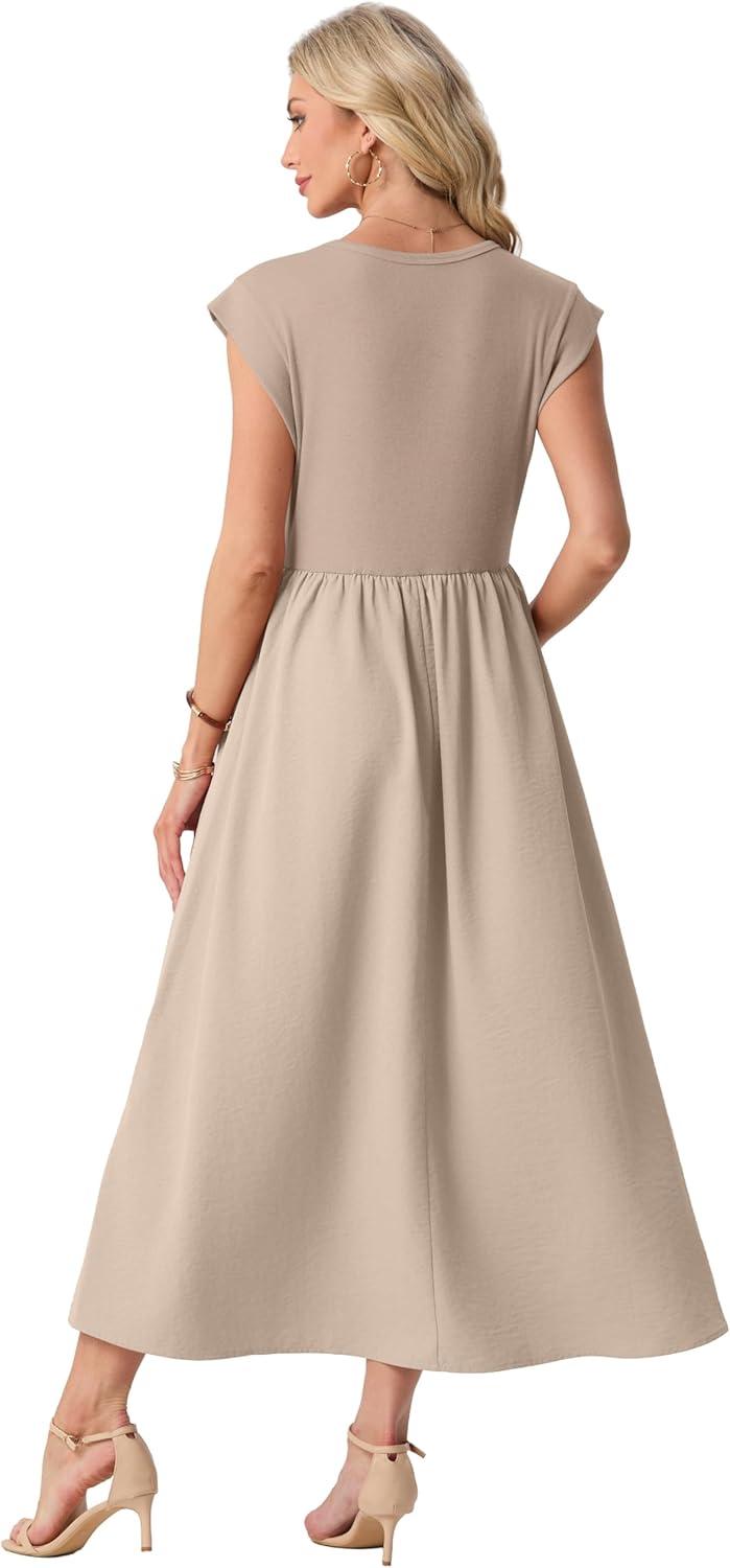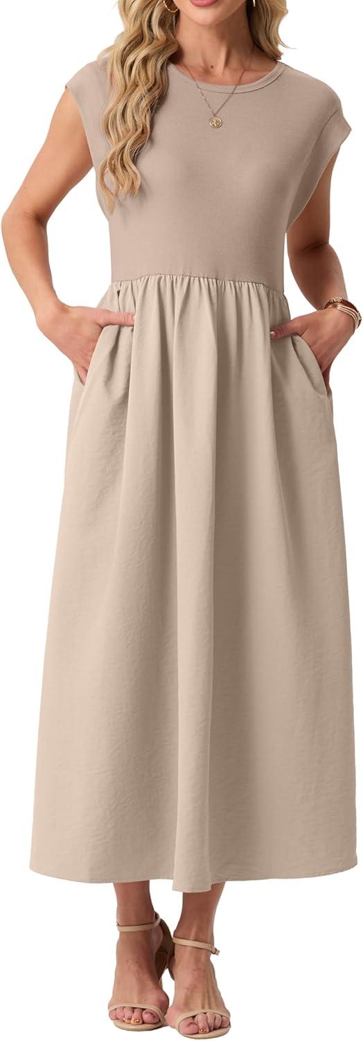 GRECERELLE Women’s 2026 Spring & Summer Cap Sleeve Vacation Casual A Line Maxi Dresses with Pockets(Gray Khaki)