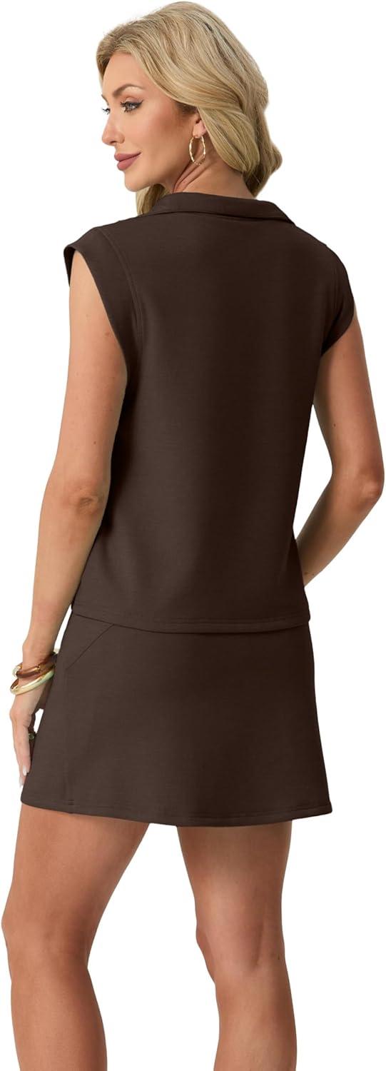 GRECERELLE Women’s 2026 Summer 2 Piece Skort Sets Cap Sleeve Zip Collared Top Matching Tennis Skirt with Pockets for Athletic(Dark Coffee)