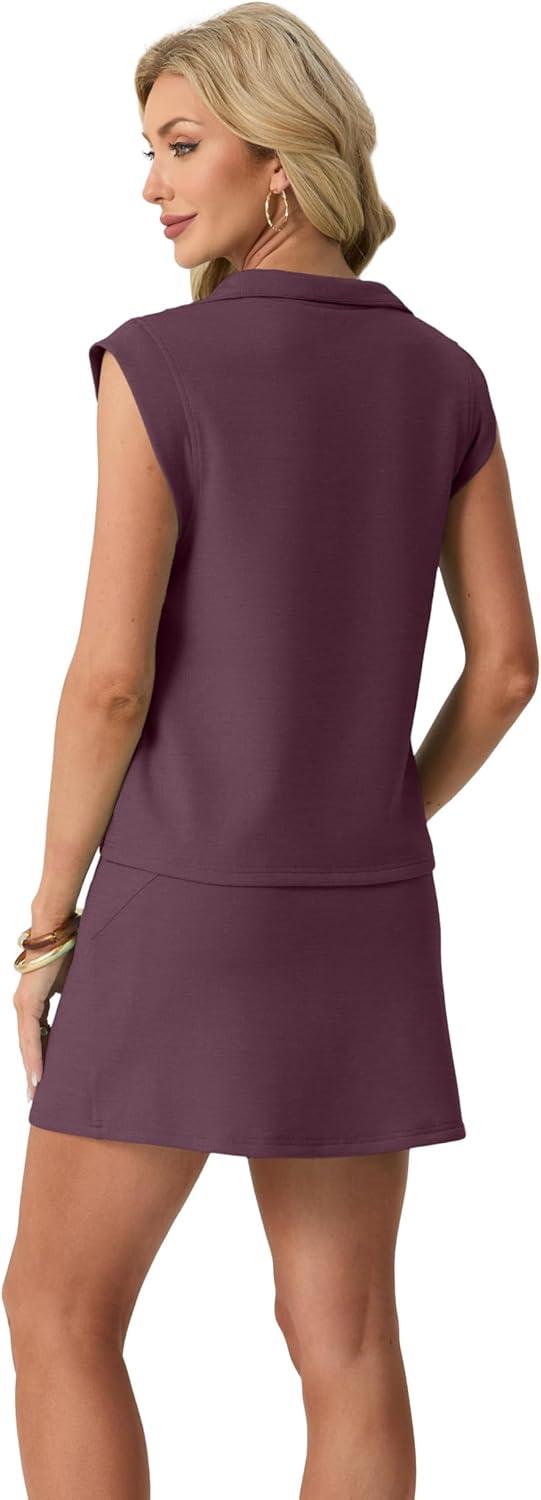 GRECERELLE Women’s 2026 Summer 2 Piece Skort Sets Cap Sleeve Zip Collared Top Matching Tennis Skirt with Pockets for Athletic(Rosewood)