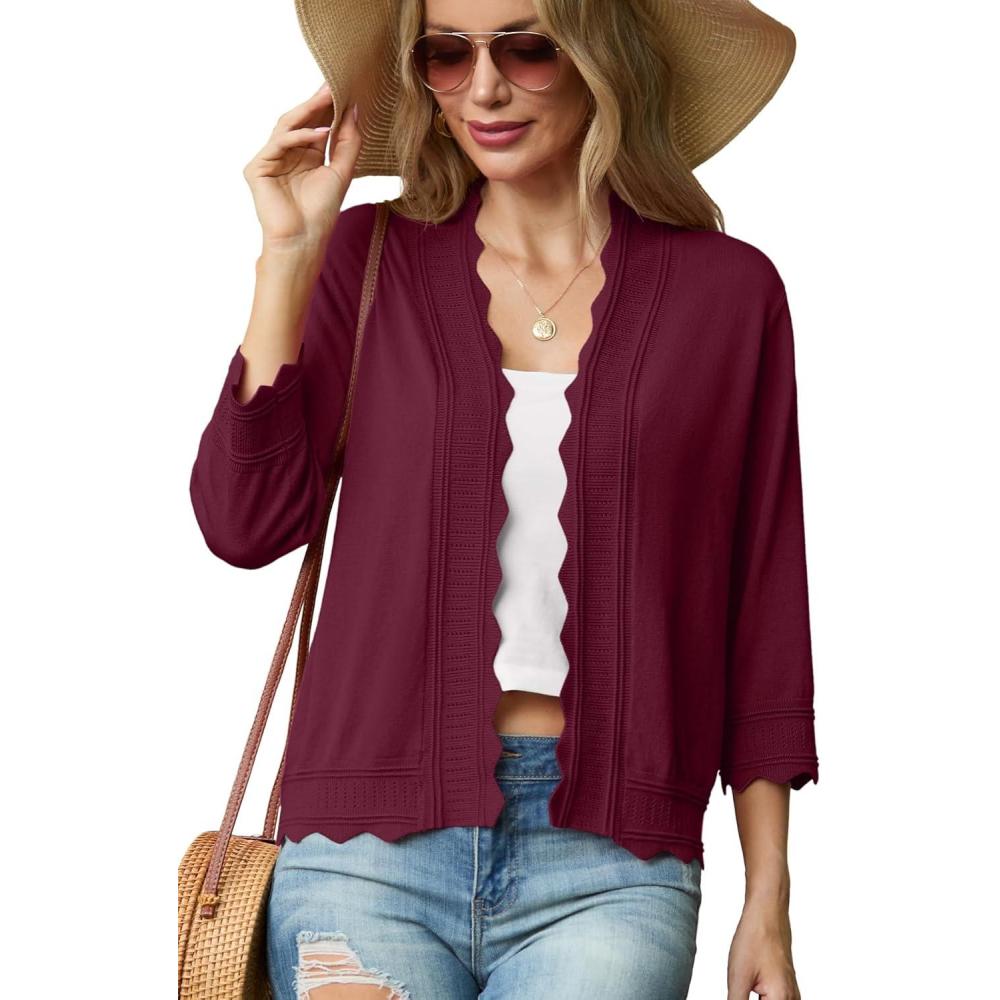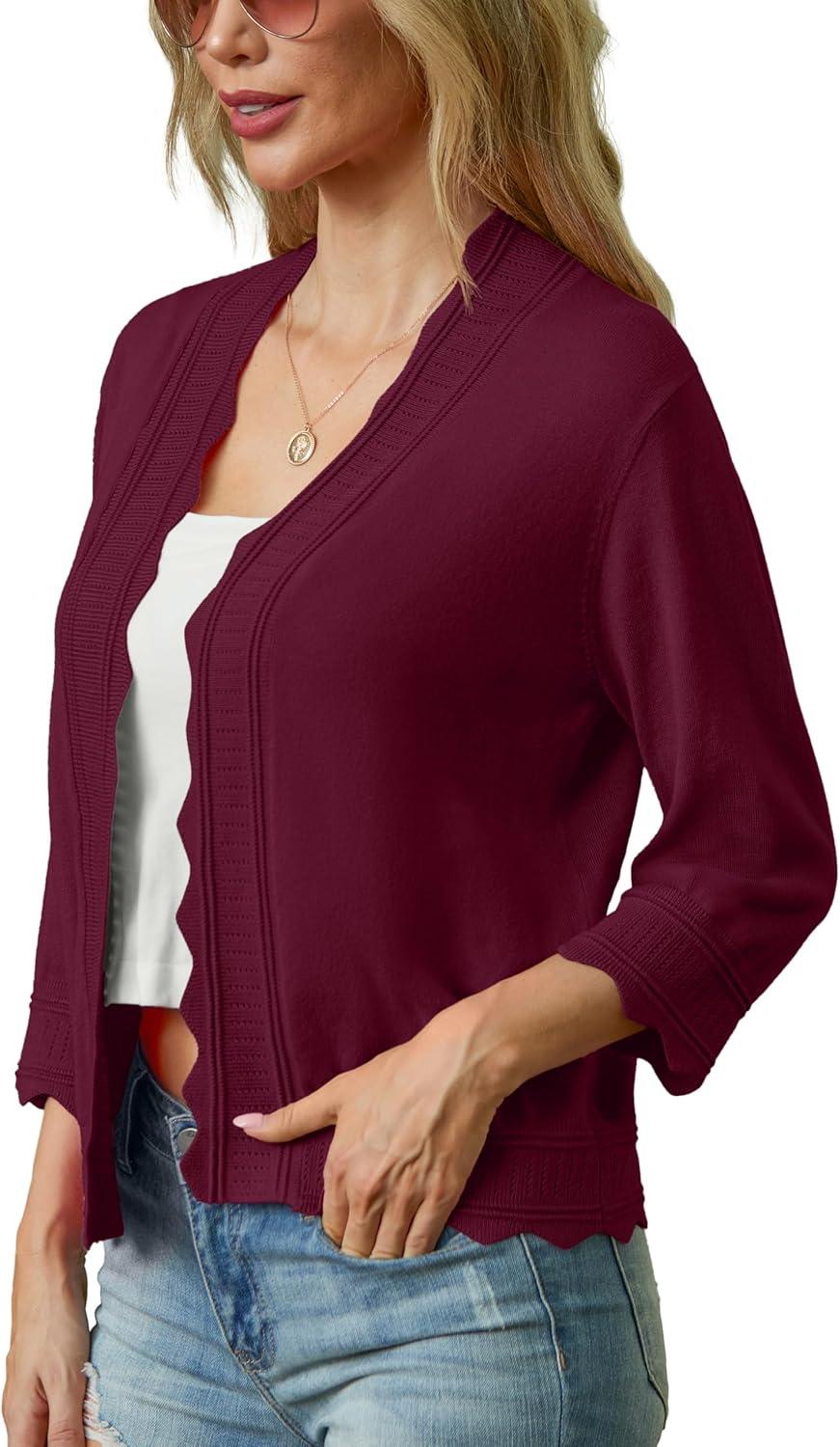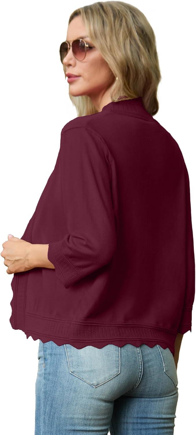 GRECERELLE Women's 3/4 Sleeve Summer Lightweight Knit Cropped Shrugs Cardigan Sweater(Burgundy)