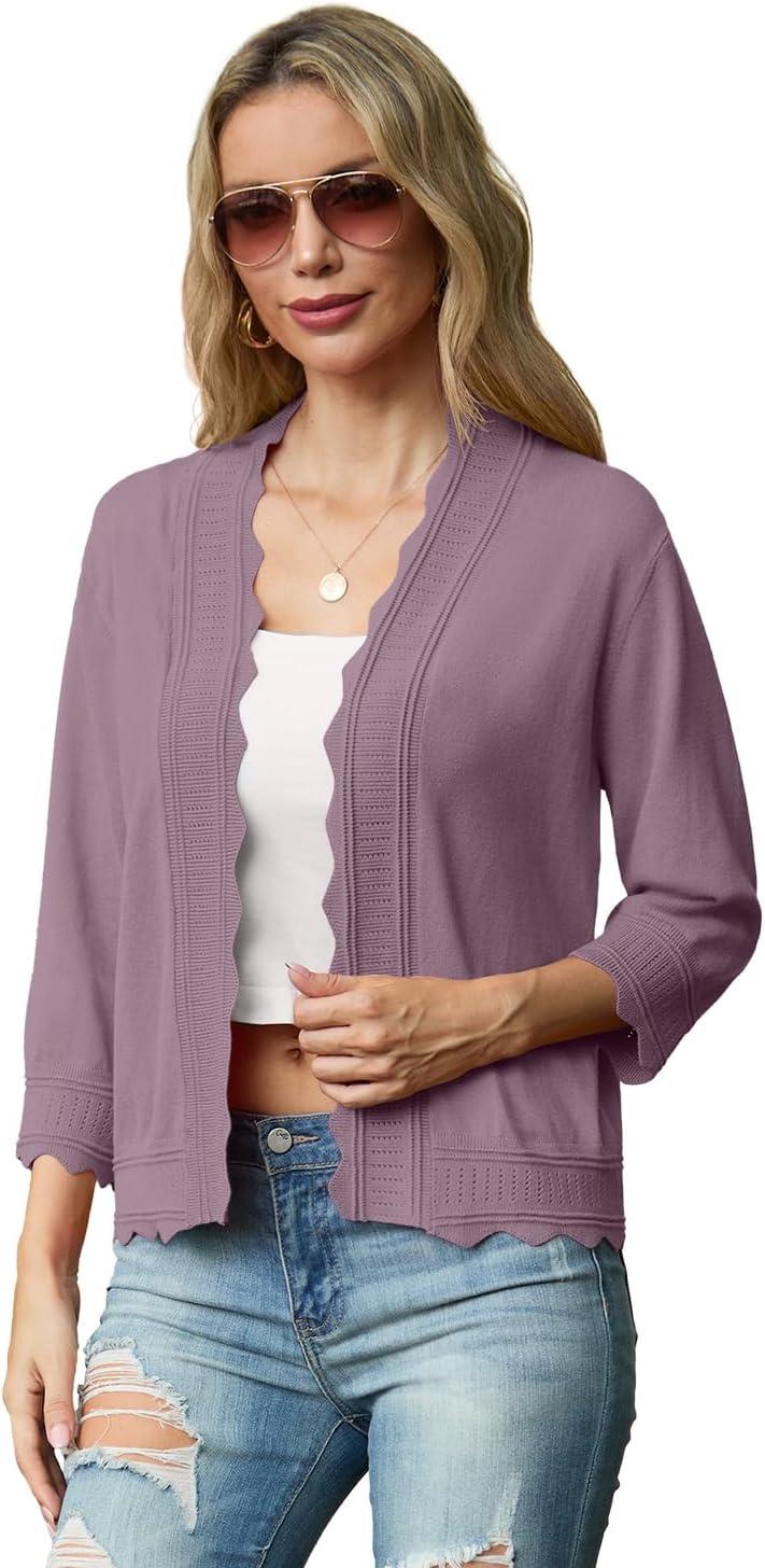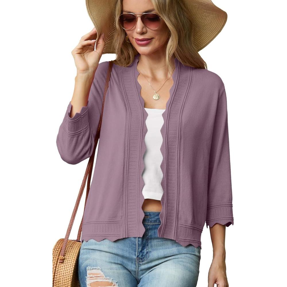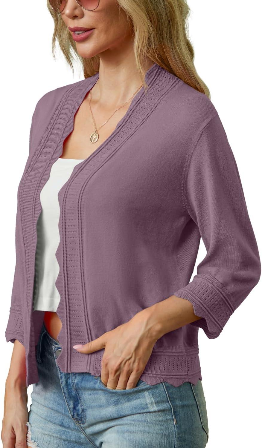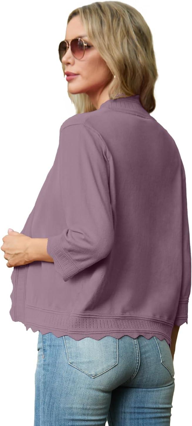 GRECERELLE Women's 3/4 Sleeve Summer Lightweight Knit Cropped Shrugs Cardigan Sweater(Purple Gray)