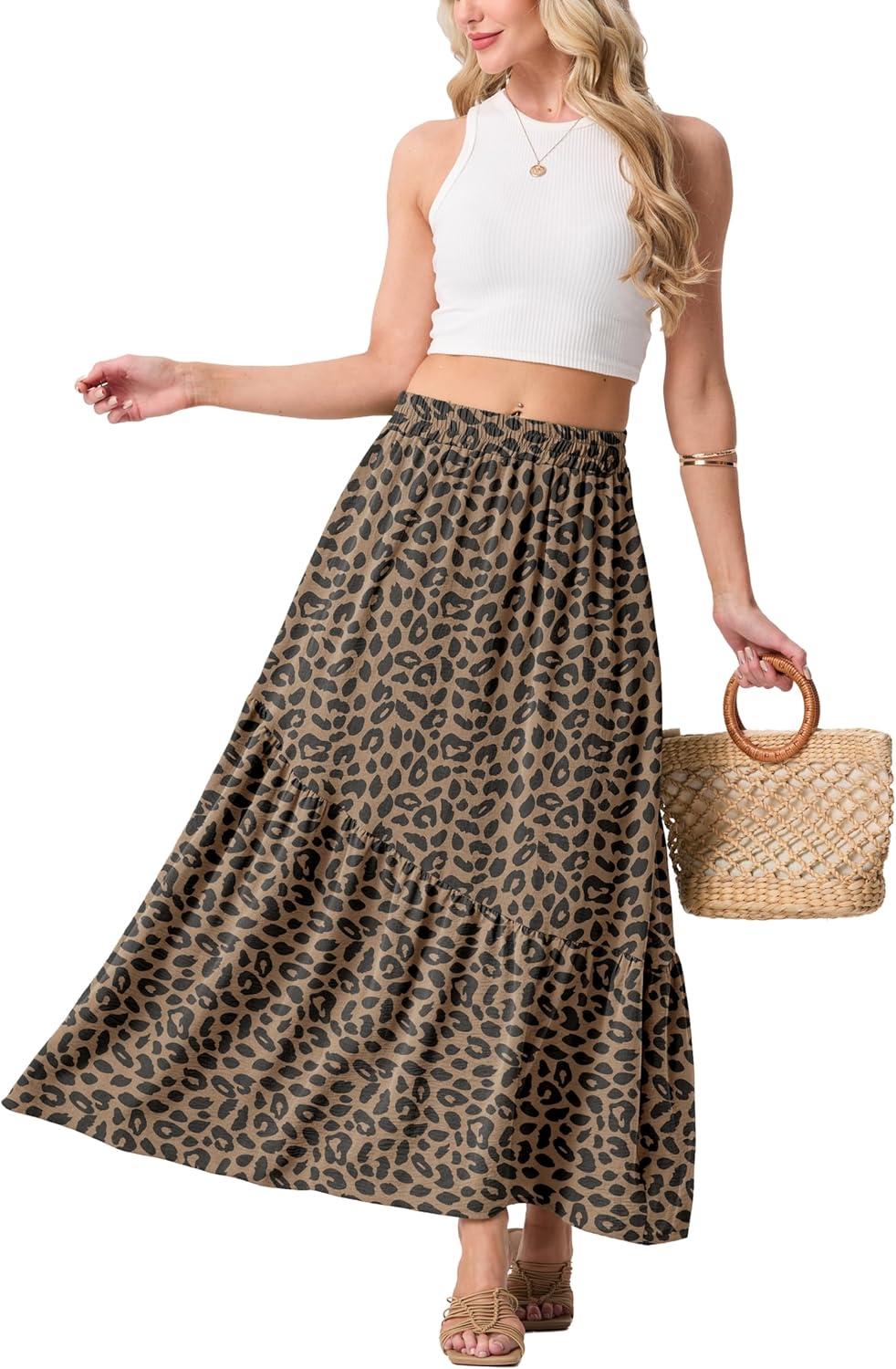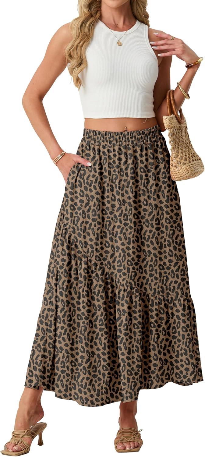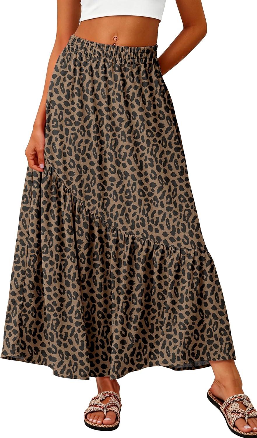 GRECERELLE Women’s Boho Maxi Skirt High Waist Pleated A-Line Flowy Swing Asymmetric Tiered Long Skirts with Pockets(Ld Khaki)