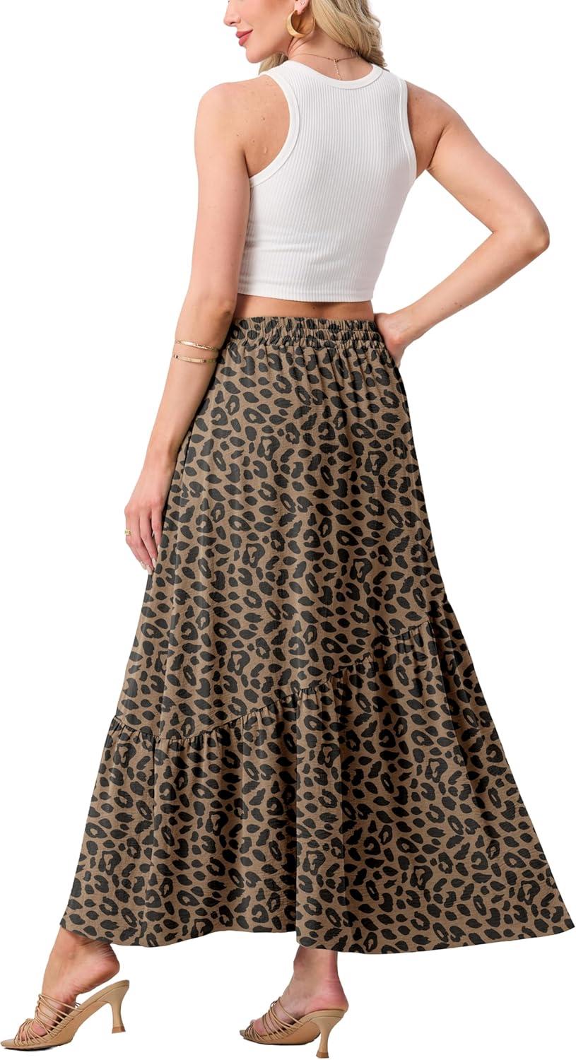 GRECERELLE Women’s Boho Maxi Skirt High Waist Pleated A-Line Flowy Swing Asymmetric Tiered Long Skirts with Pockets(Coffee Gray)