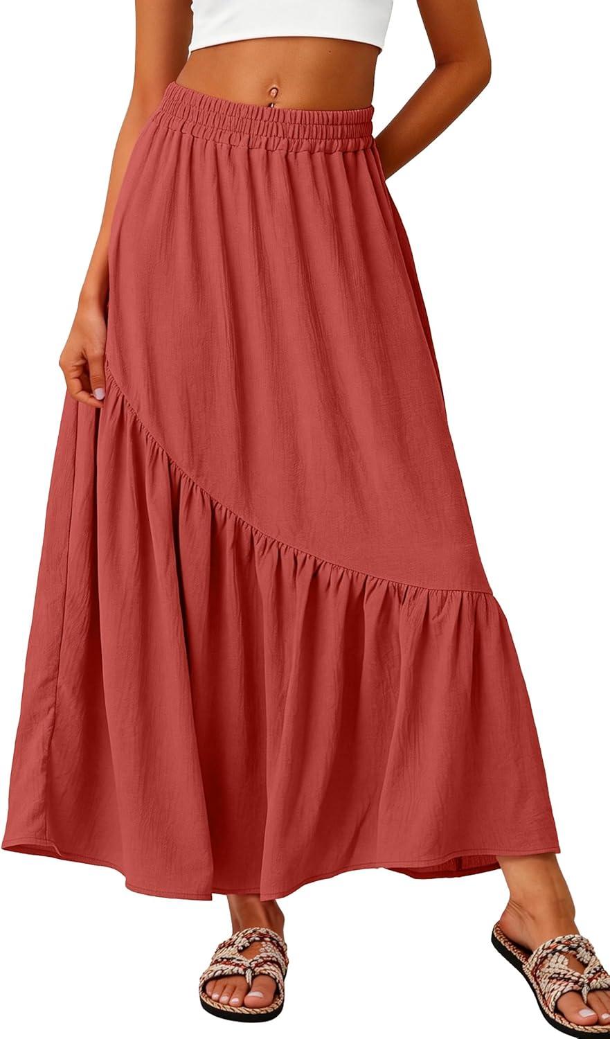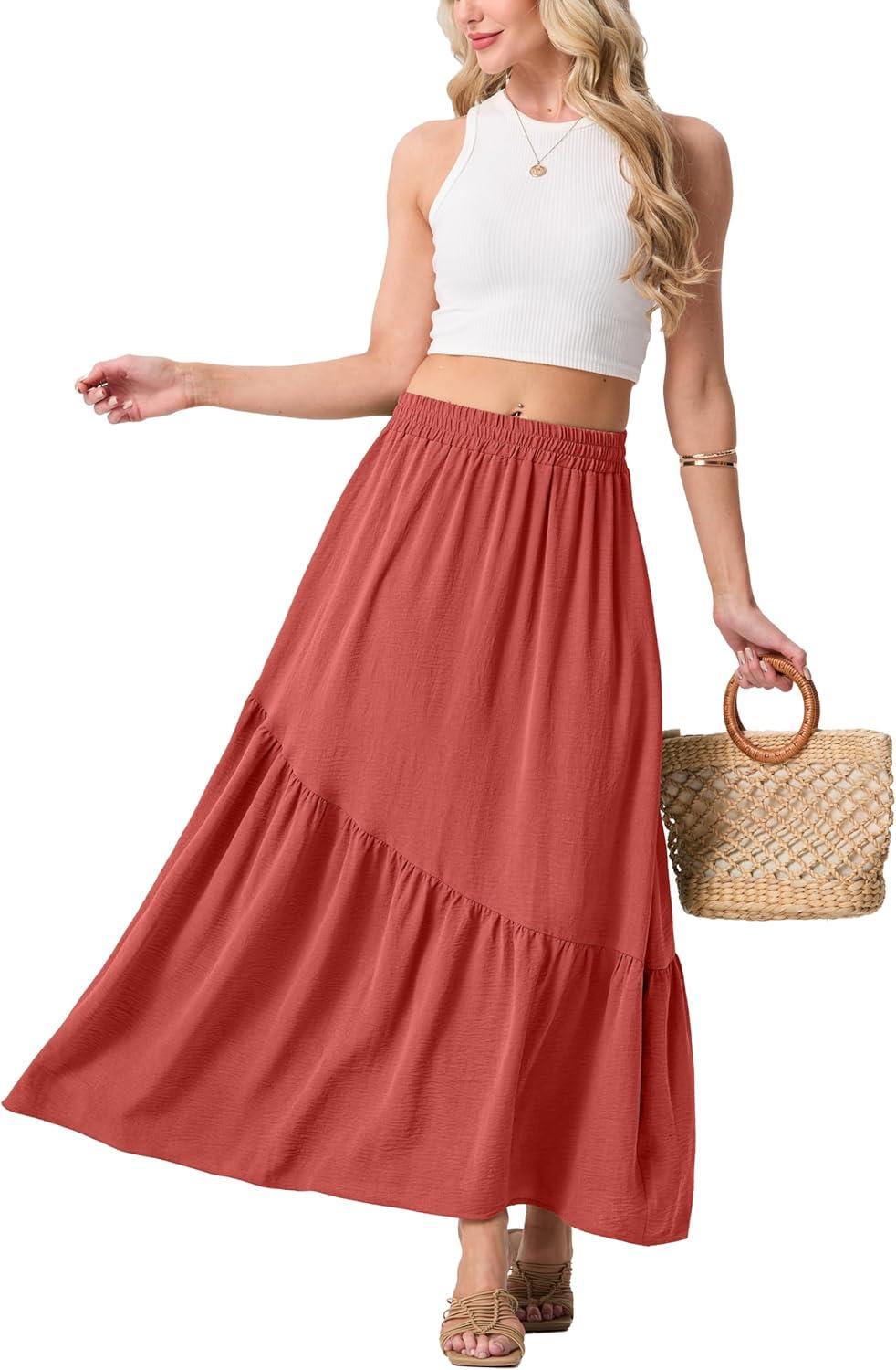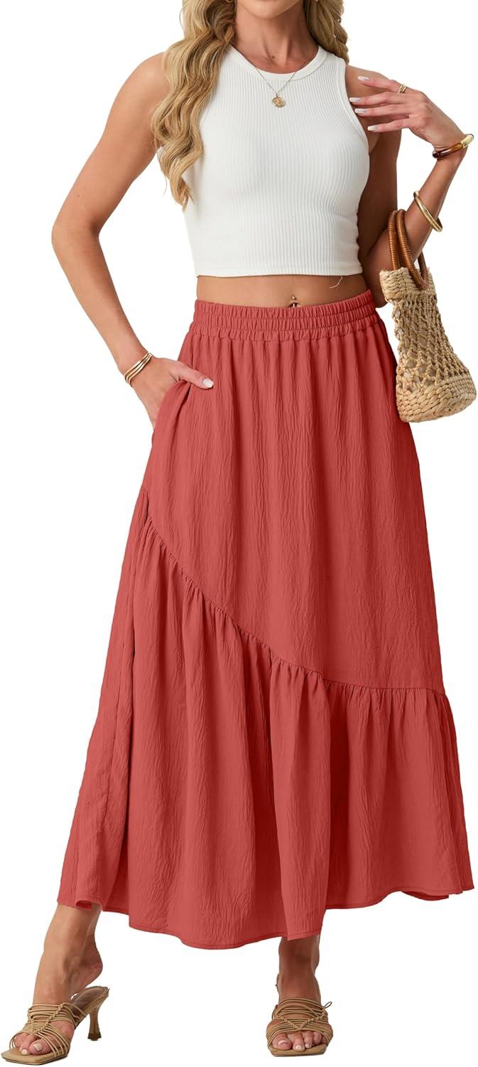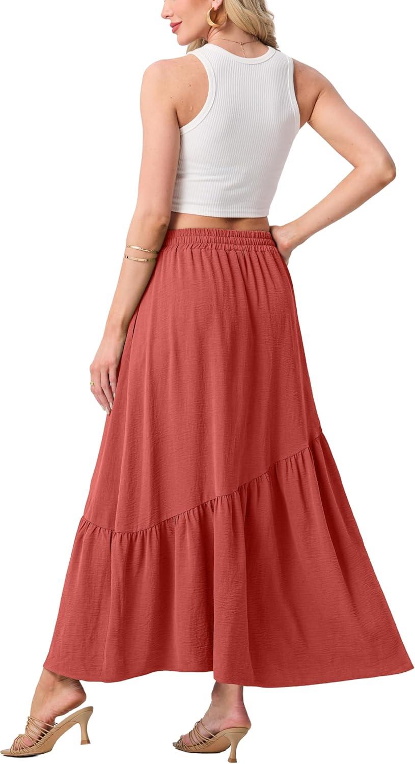 GRECERELLE Women’s Boho Maxi Skirt High Waist Pleated A-Line Flowy Swing Asymmetric Tiered Long Skirts with Pockets(Living Coral)