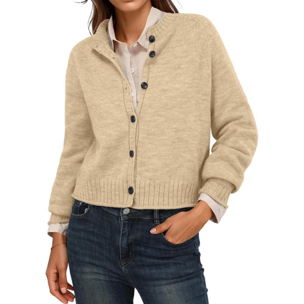 GRECERELLE Womens Cardigan Sweater Open Front Long Sleeve Crew Neck Button Down Knit Casual Jacket, S-2XL(Apricot)
