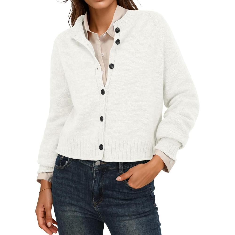 Designed for effortless transition, this chic cropped cardigan features a stand collar and classic button front for timeless appeal. Thoughtful details include naturally curled cuffs and a gently curved hem, adding a relaxed, modern touch. The comfortable mid-weight construction makes it ideal for layering without bulk.