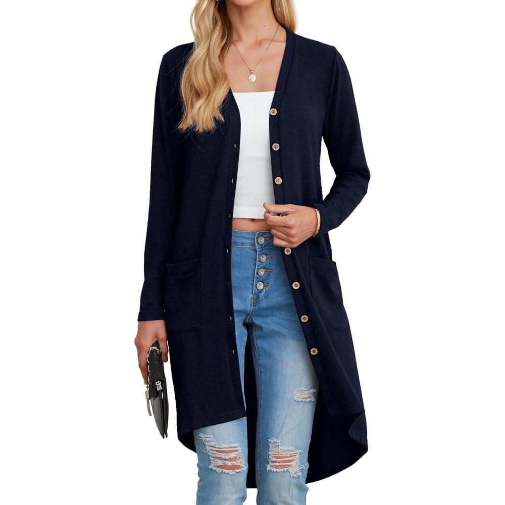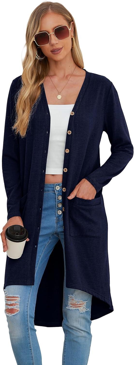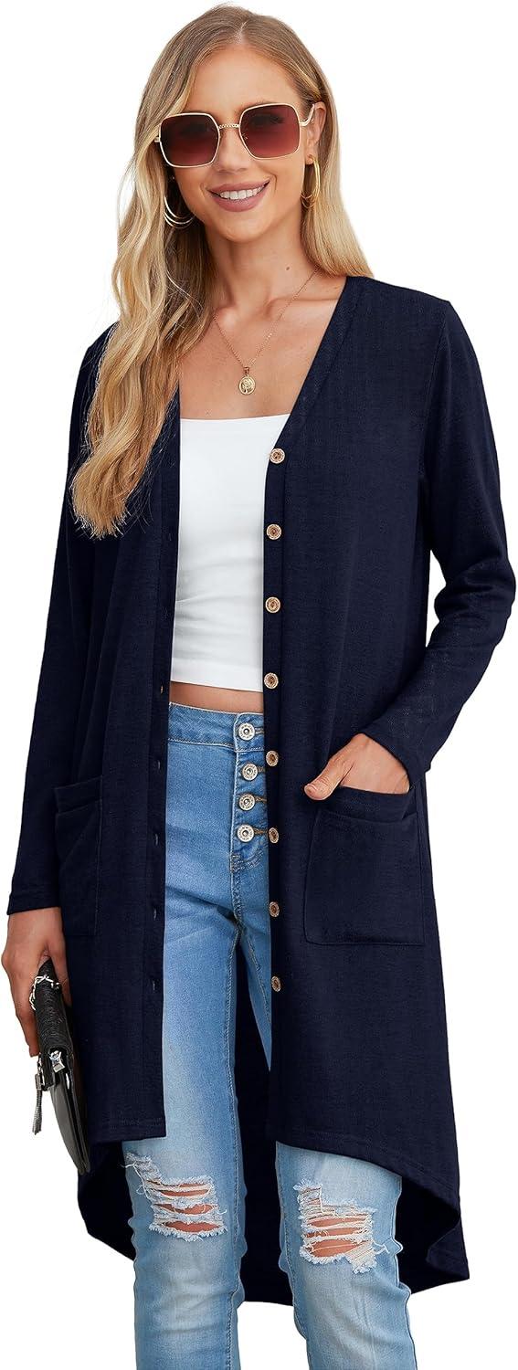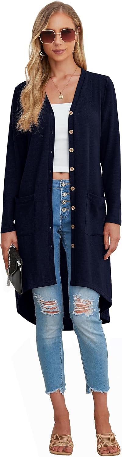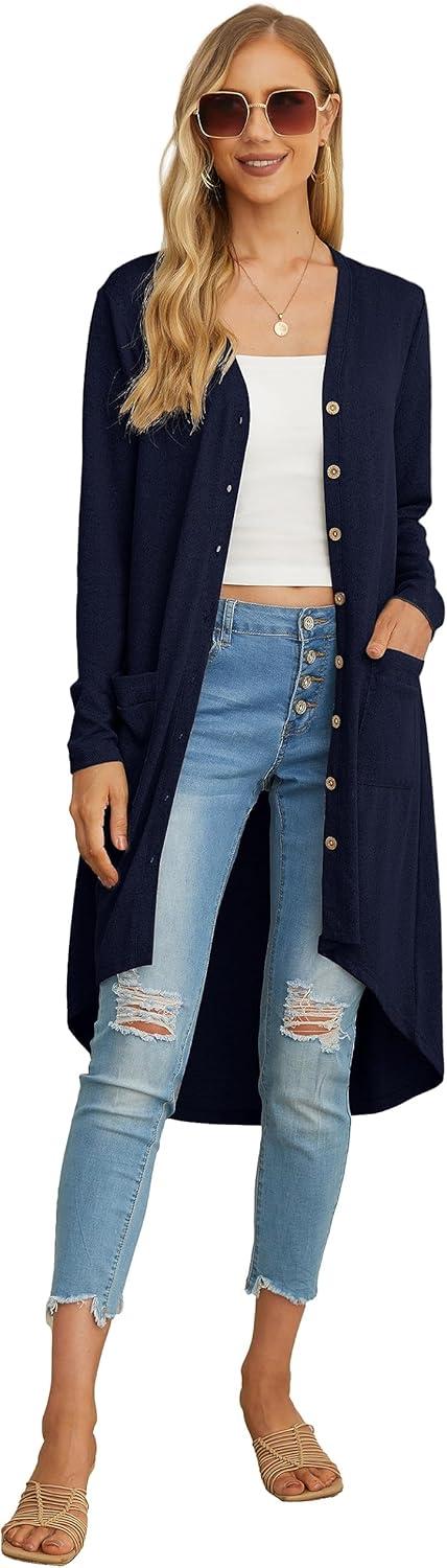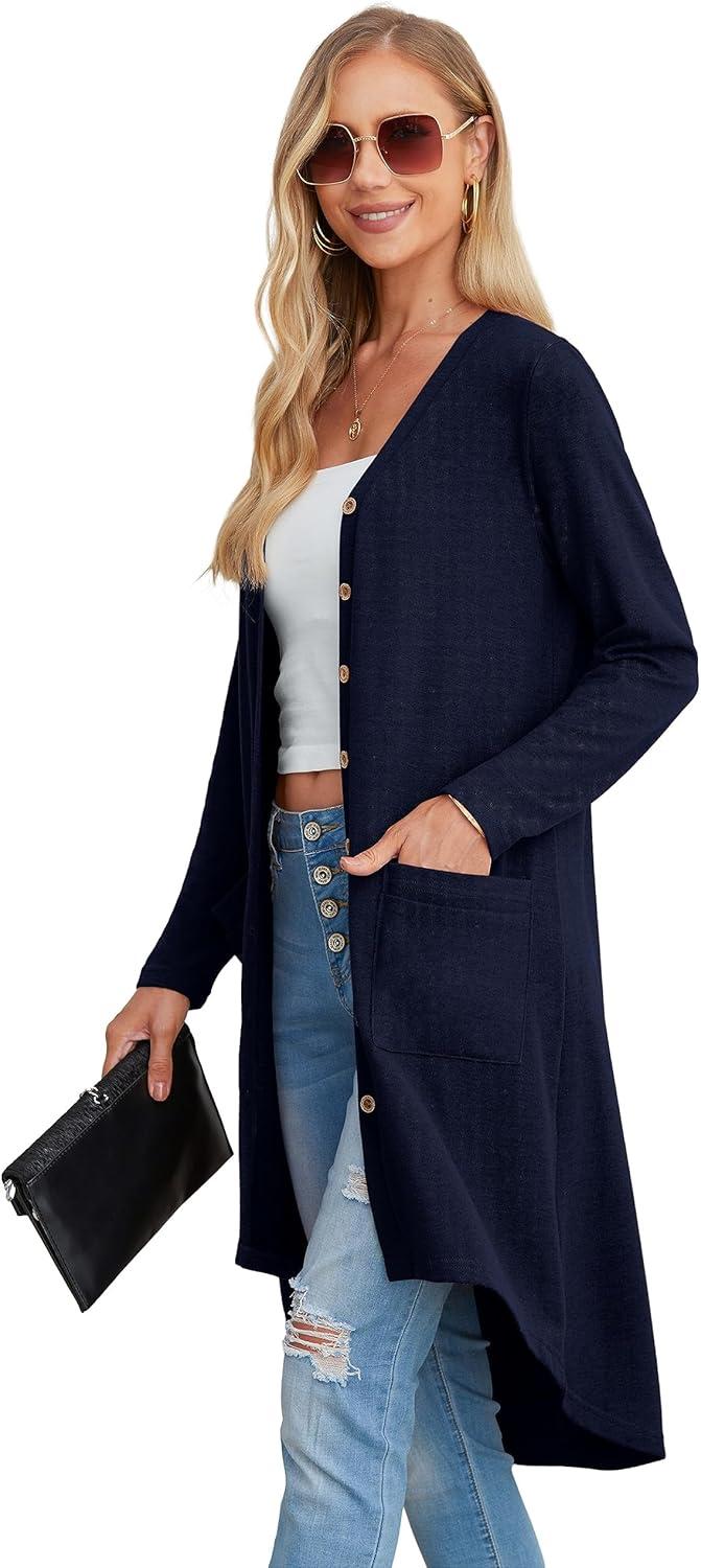 GRECERELLE Womens Cardigans Lightweight 2025 Long Sleeve Button Down Duster Casual Long Cardigan Outerwear with Pockets(Navy Blue)