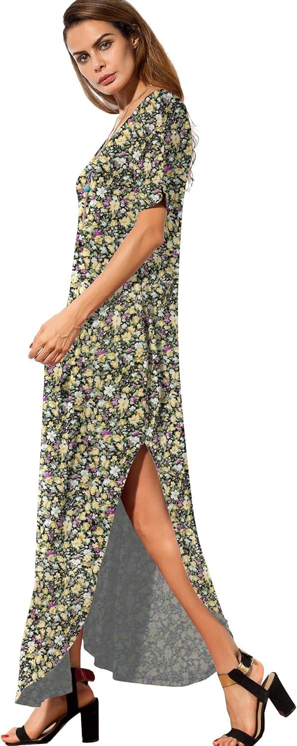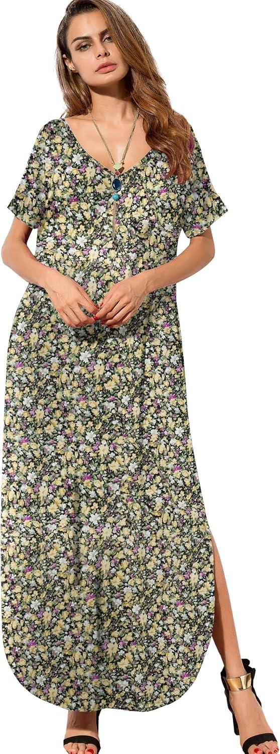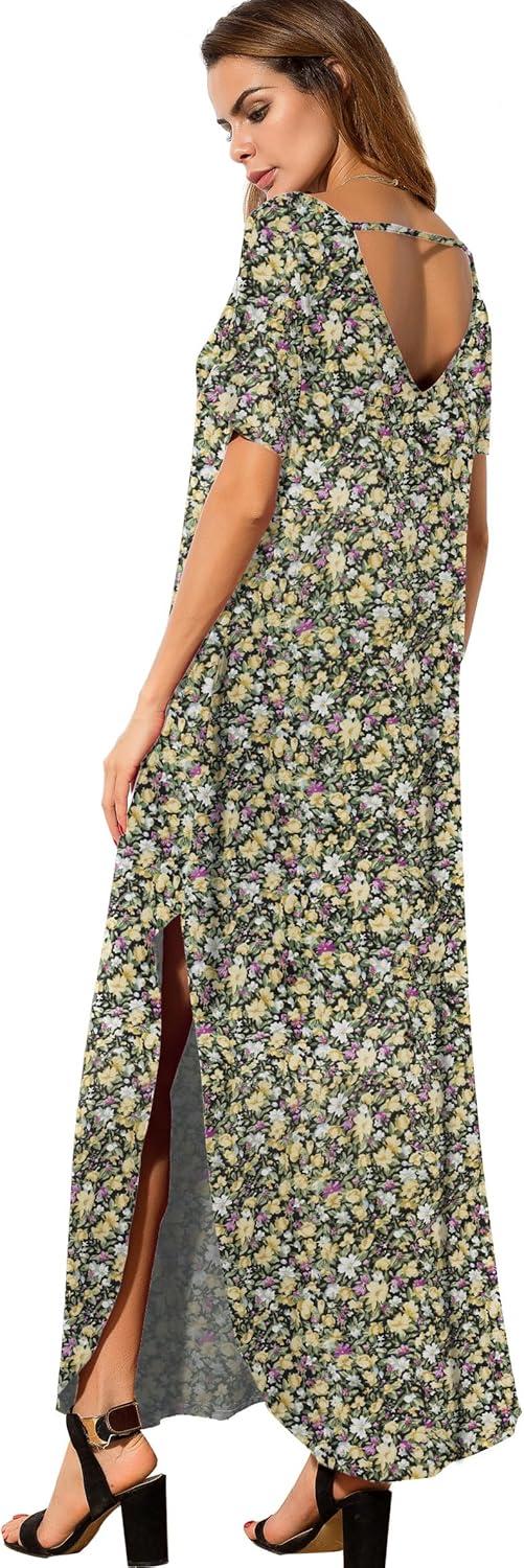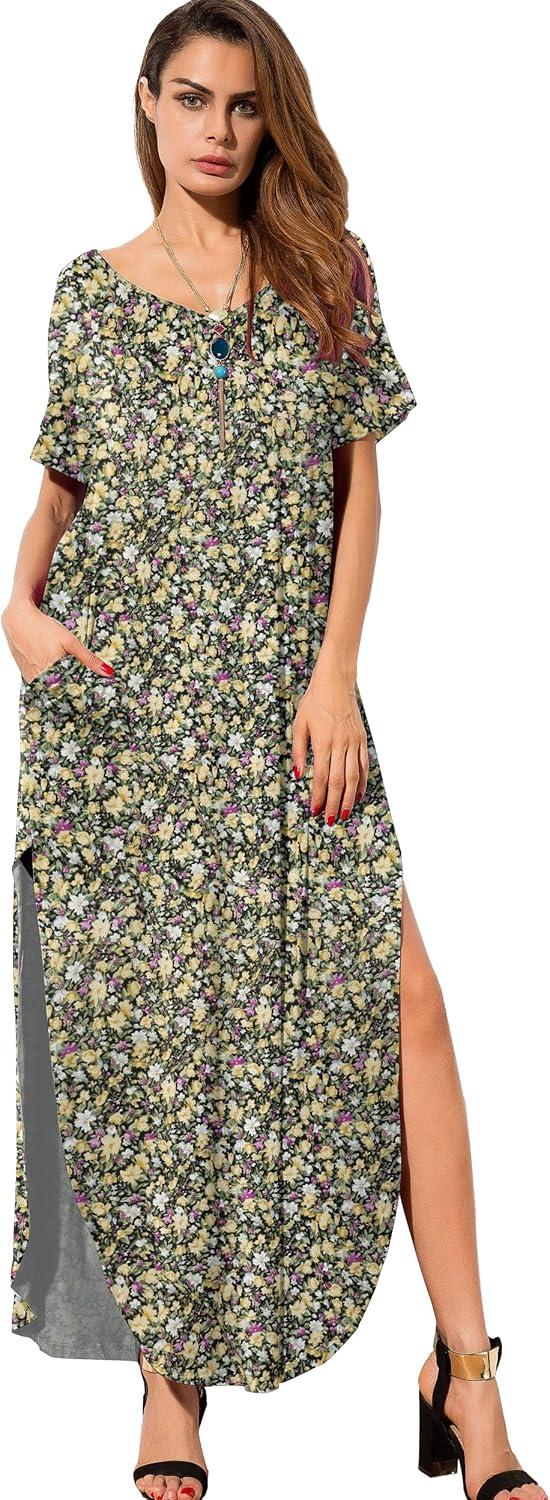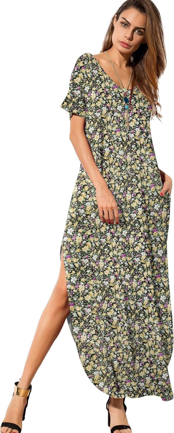 GRECERELLE Women’s Casual Loose Pocket Long Dress Short Sleeve Split Maxi Dresses(Black Daffodil)