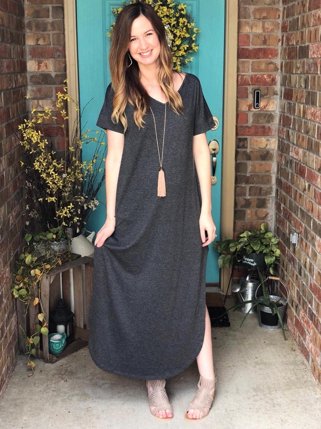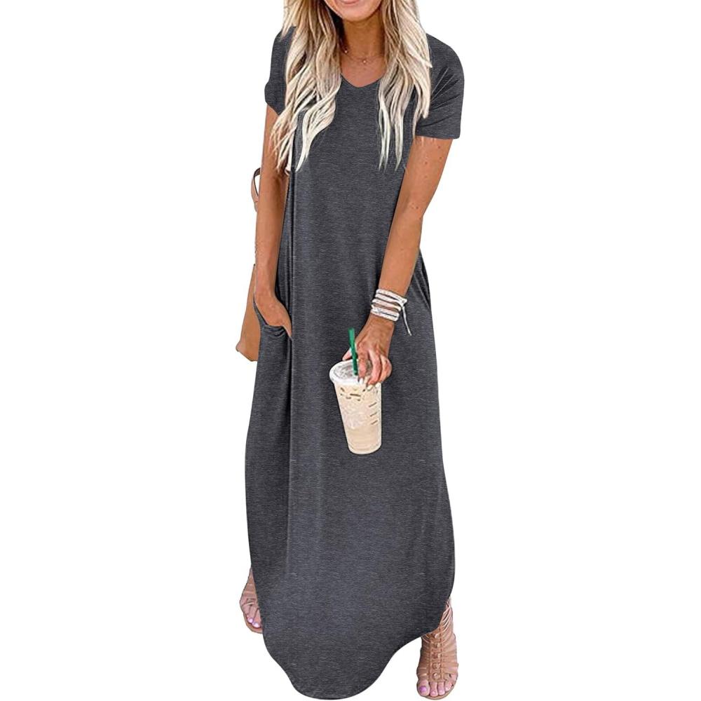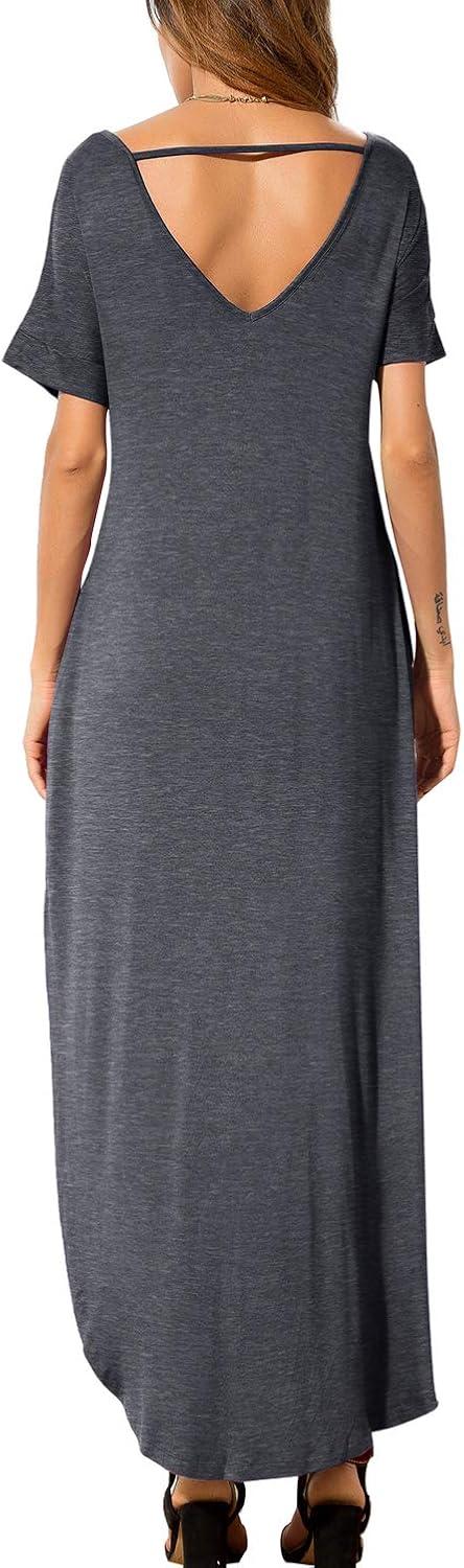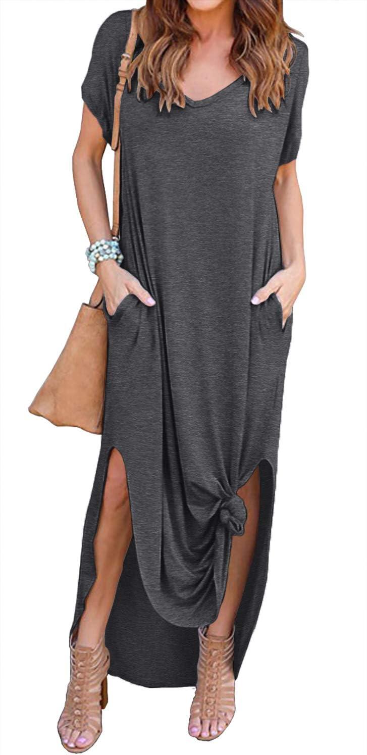 GRECERELLE Women’s Casual Loose Pocket Long Dress Short Sleeve Split Maxi Dresses(Dark Gray)