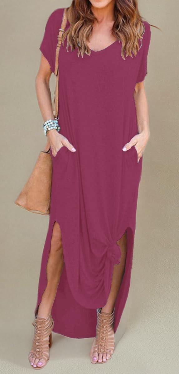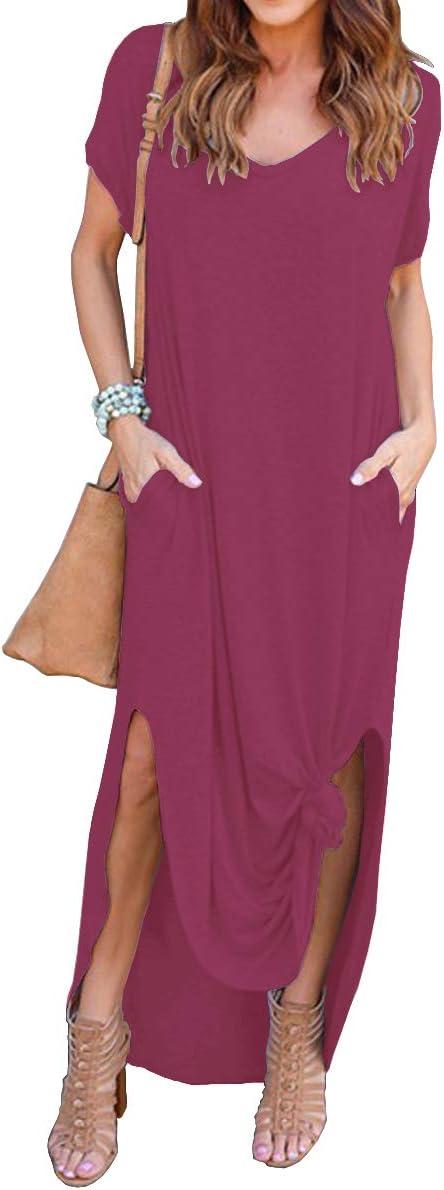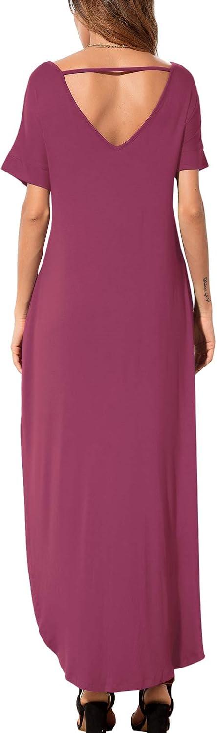 GRECERELLE Women’s Casual Loose Pocket Long Dress Short Sleeve Split Maxi Dresses(Red Gray)