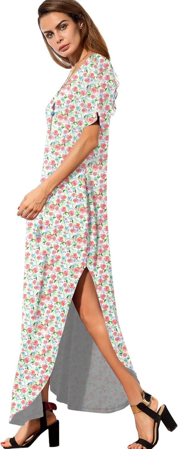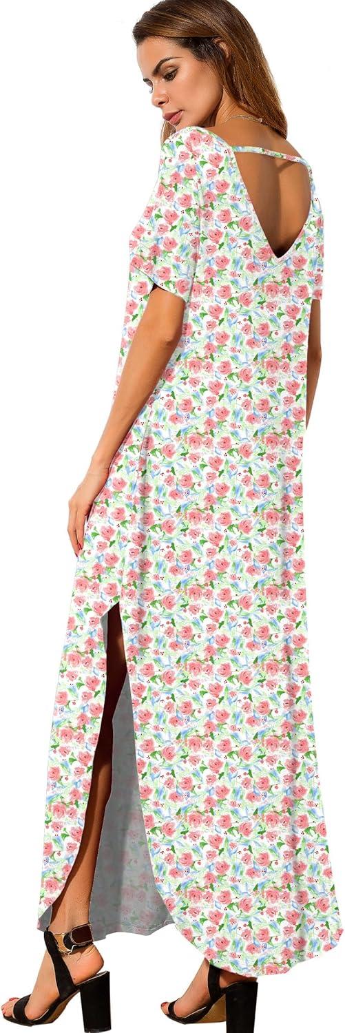 GRECERELLE Women’s Casual Loose Pocket Long Dress Short Sleeve Split Maxi Dresses(White Pink Rose)